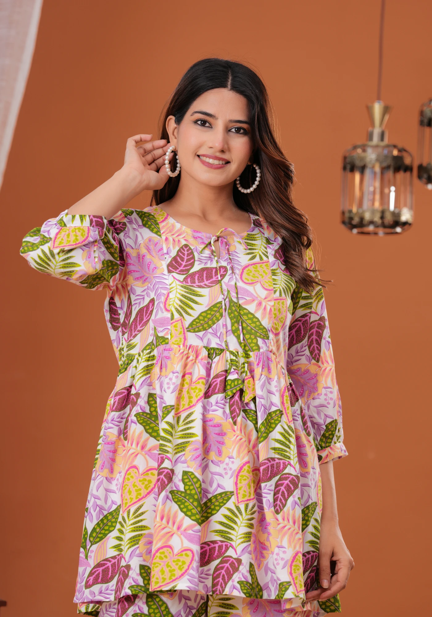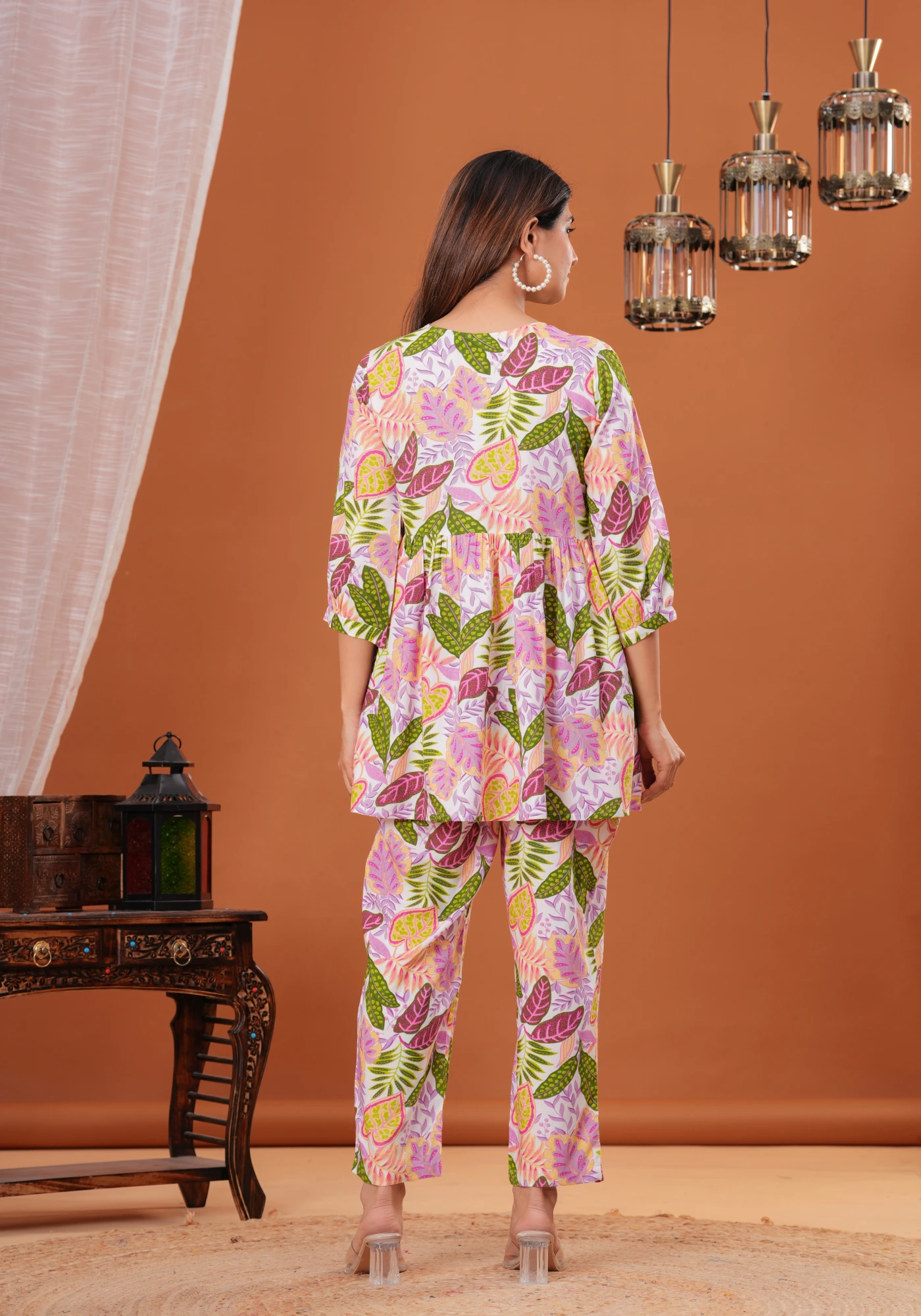 The Floral Printed Maternity Top and Pant Set is a soft and flowy rayon co-ord designed to support you through every phase of motherhood. Made from lightweight, breathable rayon fabric, this two-piece set ensures all-day comfort while maintaining a graceful drape and elegant appearance.