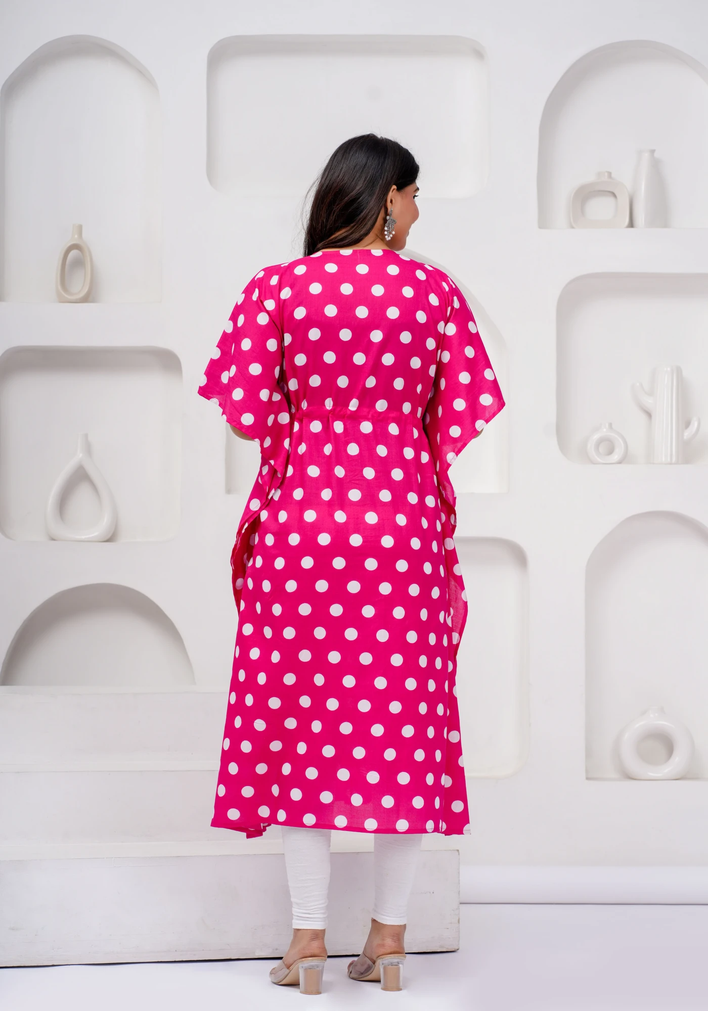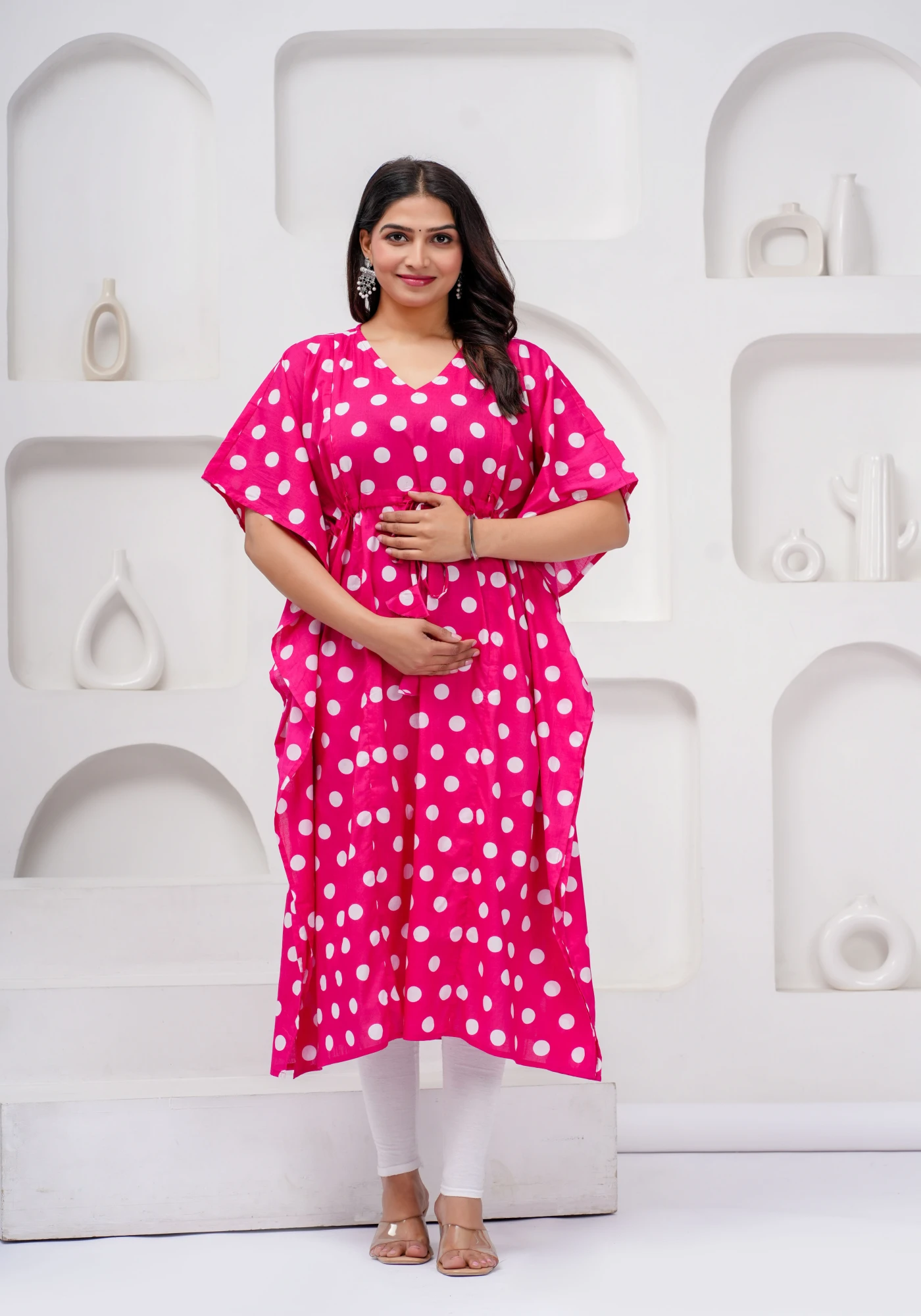 Stay comfortable and stylish during pregnancy and beyond with this polka dot maternity kaftan dress. Made from soft breathable cotton fabric, this maternity essential ensures all-day comfort for expecting and new moms.