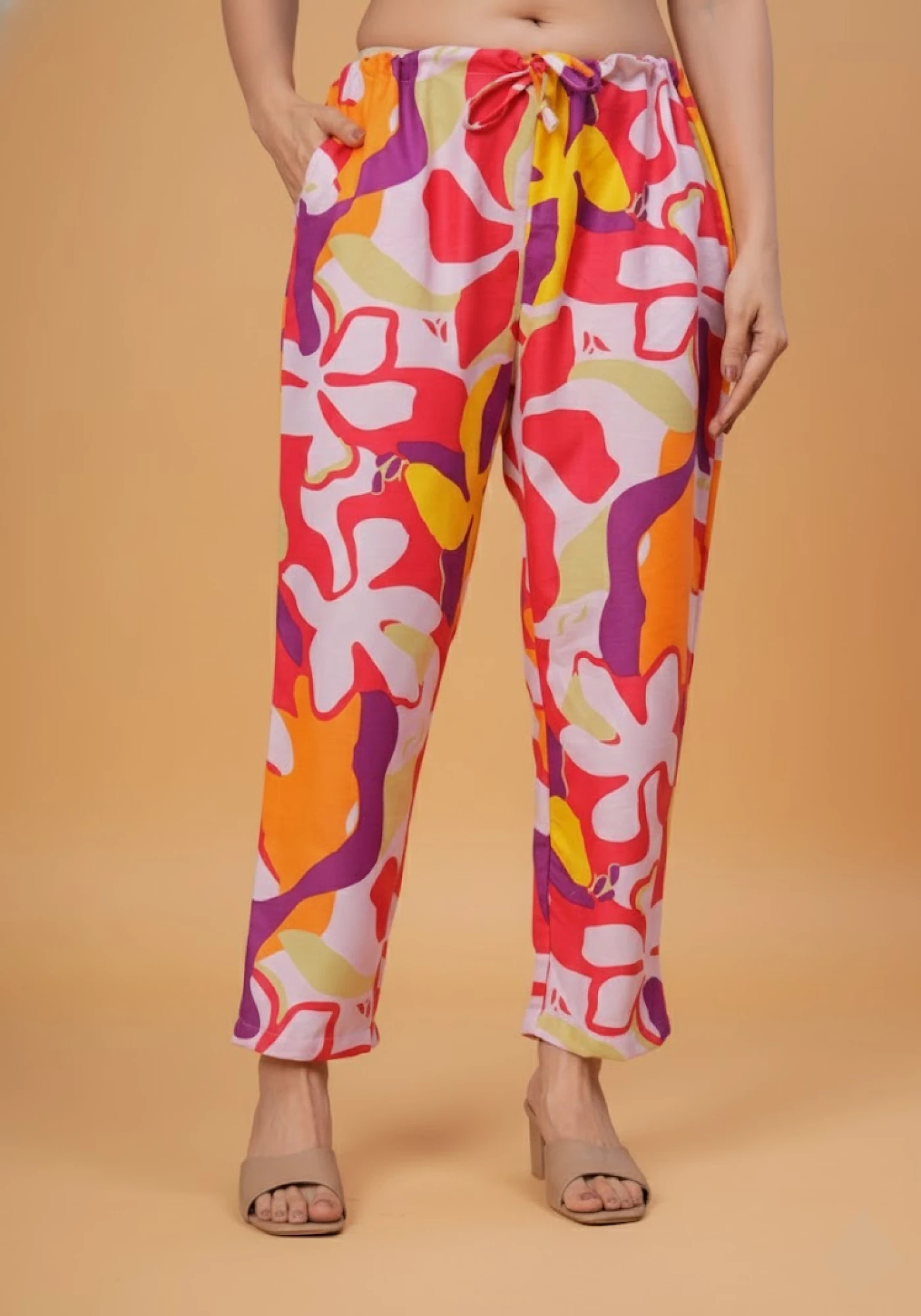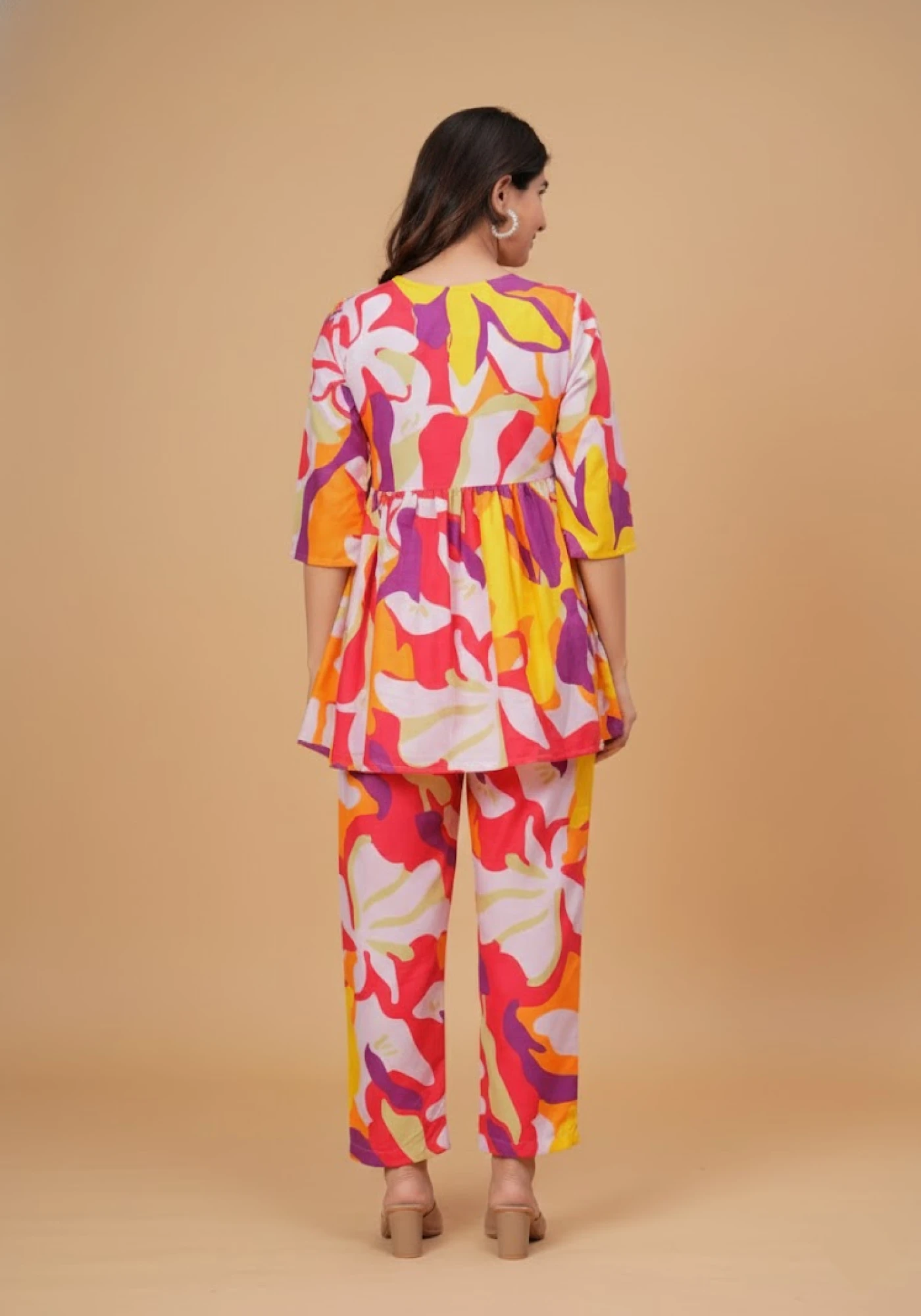 This RedPurple Abstract Print Maternity & Feeding Co-ord Set Crafted from high-quality Poly Rayon fabric, providing optimal comfort throughout the day. Featuring both side concealed zips on the yoke, this set offers convenience and ease during maternity and nursing periods, allowing for effortless feeding access. The top is thoughtfully designed to accommodate the changing body shape, ensuring a flattering fit at every stage of pregnancy. Meanwhile, the drawstring waistband and one pocket on the pant provides adjustability and support.