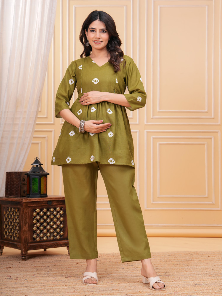 How to Style : Style this casual maternity top and pant set effortlessly by accessorizing with delicate jewelry and a pair of comfortable slip-on shoes. The concealed zips on the yoke add functionality without compromising style.
