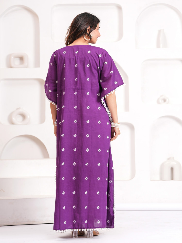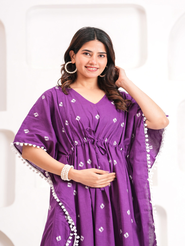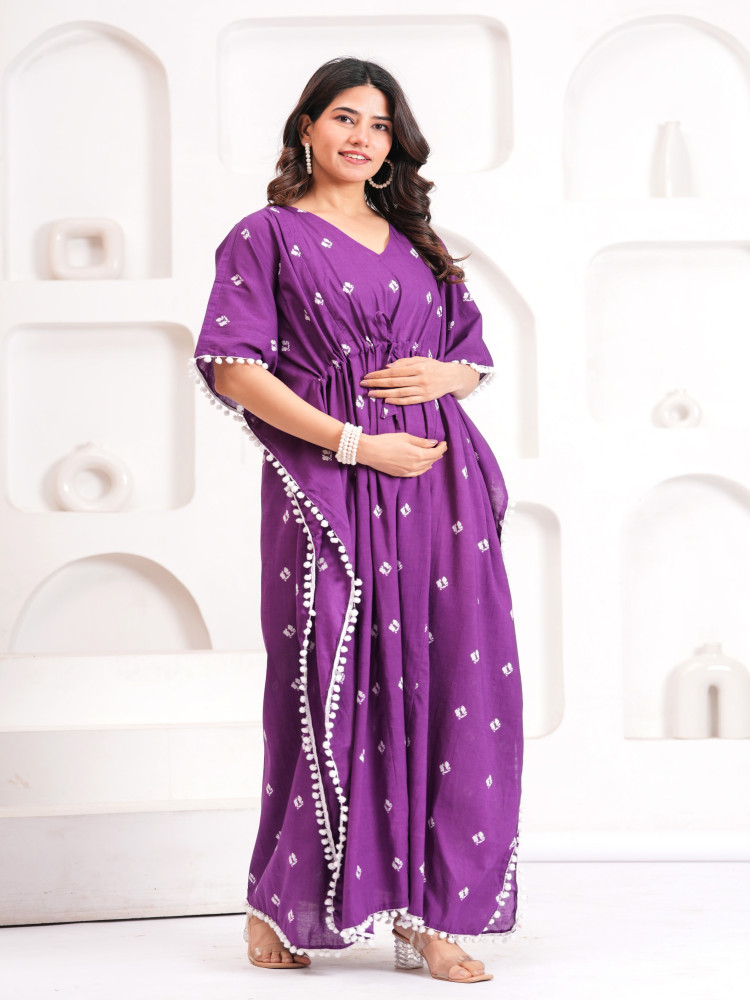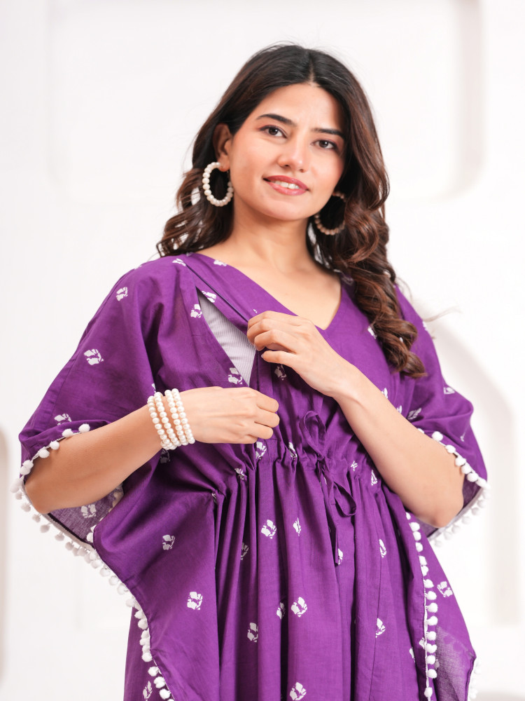 This cotton printed maternity kaftan is designed for ultimate comfort and style. Featuring concealed zippers on both sides, it allows easy nursing access for new moms. The free-size fit ensures a relaxed and breathable feel during pregnancy and postpartum. Its elegant floral print adds a touch of charm to your maternity wardrobe. Perfect for lounging or casual outings, this kaftan blends fashion with functionality.
