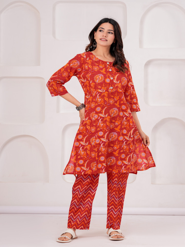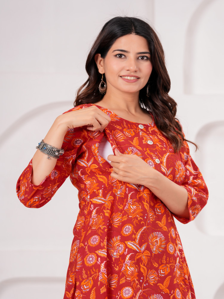 This Floral Printed Maternity Kurta and Pant Set Crafted from high-quality Cotton fabric, providing optimal comfort throughout the day. Featuring both side concealed zips on the yoke, this set offers convenience and ease during maternity and nursing periods, allowing for effortless feeding access. The top is thoughtfully designed to accommodate the changing body shape, ensuring a flattering fit at every stage of pregnancy. Meanwhile, the drawstring waistband and one pocket on the pant provides adjustability and support.