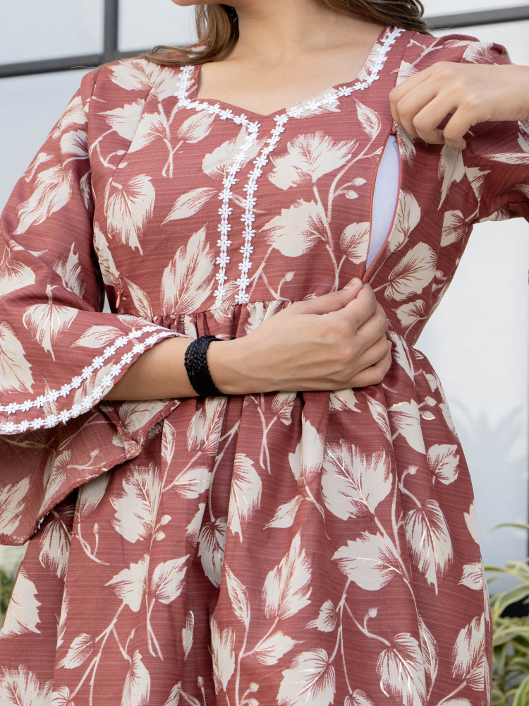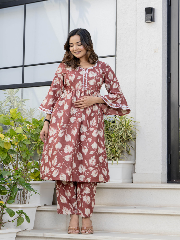 This Floral Printed Maternity Kurta and Pant Set Crafted from high-quality Cotton Blend fabric, providing optimal comfort throughout the day. Featuring both side concealed zips on the yoke and lace detailing all over. This set offers convenience and ease during maternity and nursing periods, allowing for effortless feeding access. The top is thoughtfully designed to accommodate the changing body shape, ensuring a flattering fit at every stage of pregnancy. Meanwhile, the drawstring waistband and one pocket on the pant provides adjustability and support.