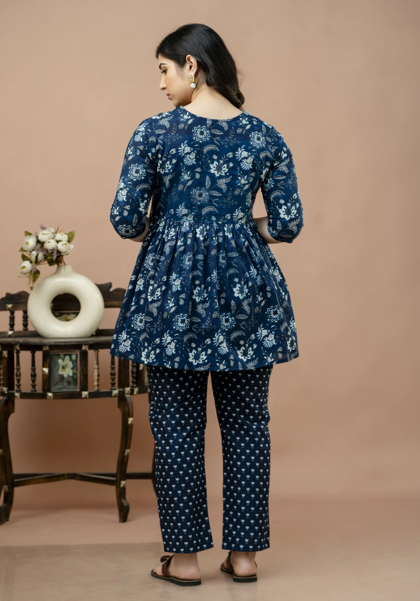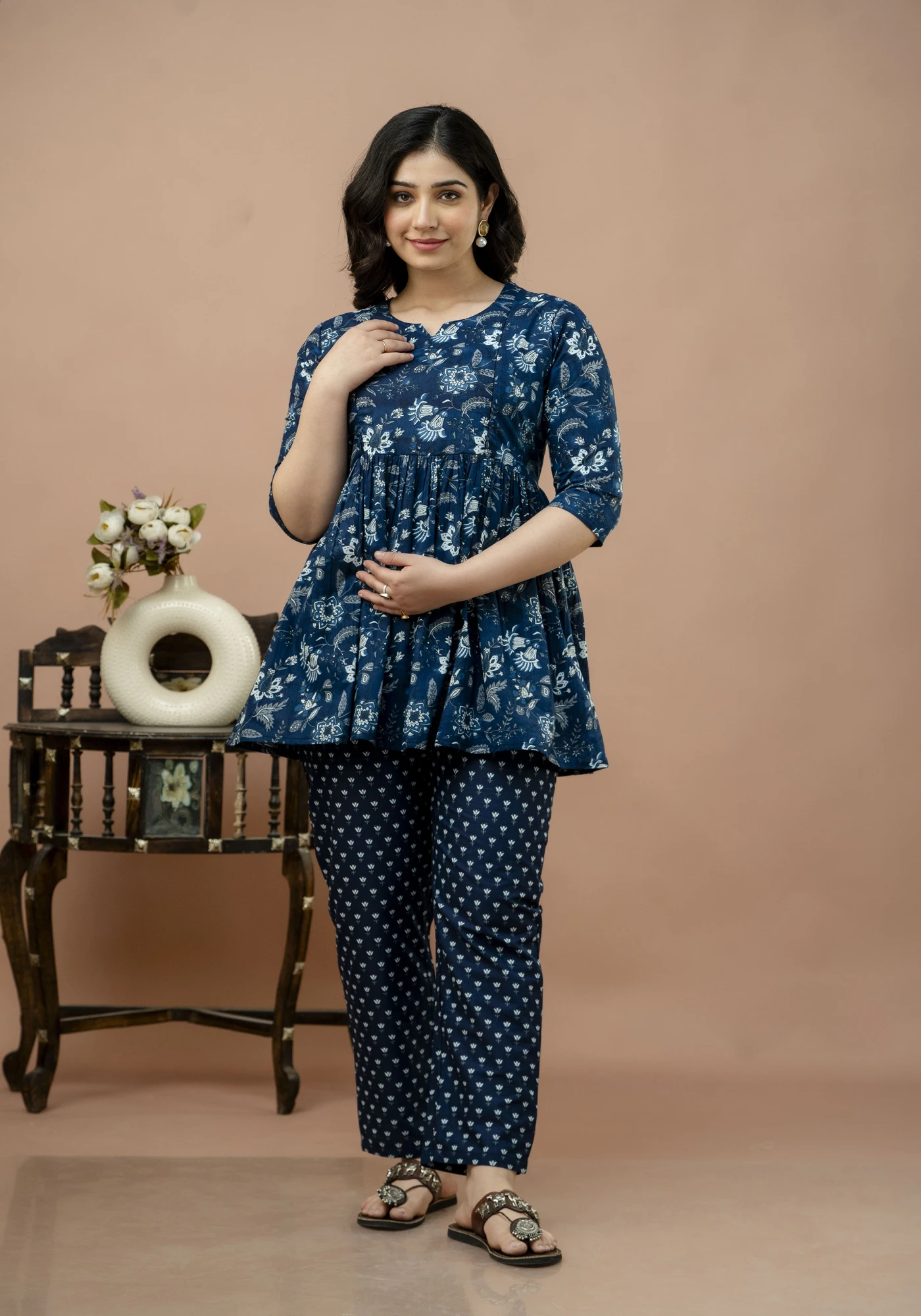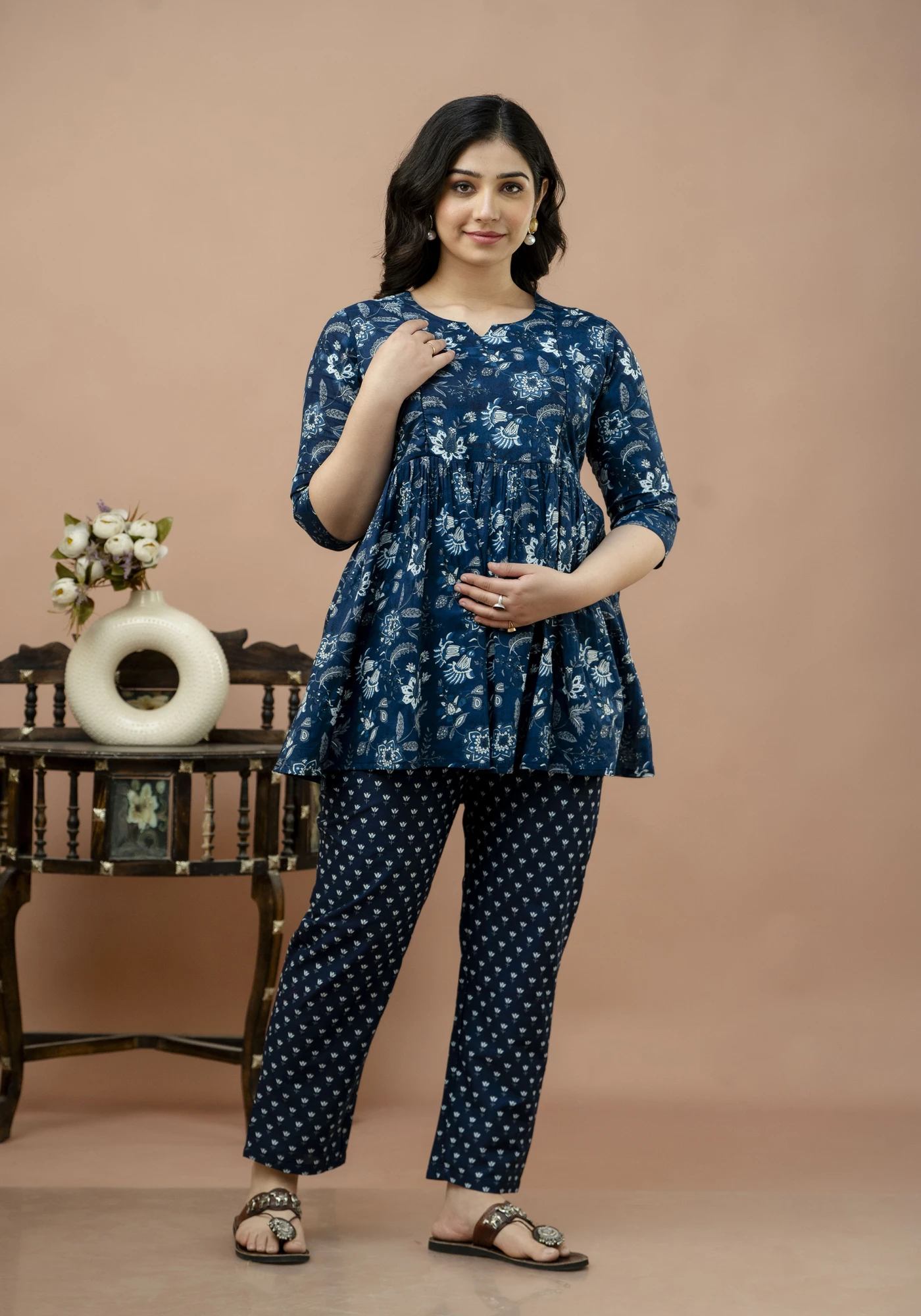 This Floral Printed Maternity Top and Pant Set Crafted from high-quality Cotton fabric, providing optimal comfort throughout the day. Featuring both side concealed zips on the yoke, this set offers convenience and ease during maternity and nursing periods, allowing for effortless feeding access. The top is thoughtfully designed to accommodate the changing body shape, ensuring a flattering fit at every stage of pregnancy. Meanwhile, the drawstring waistband and one pocket on the pant provides adjustability and support.