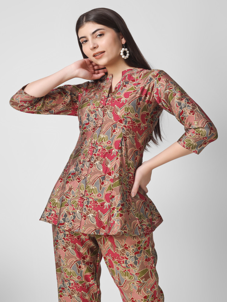 This Floral Printed Chanderi Silk Top and Pant Set is the perfect blend of comfort and style. It features a classic Top and pant Cord set, Foil Print All Over, both side pockets in Pant, Mandarin collar, 3/4 sleeves, and a stylish and super soft fabric. Perfect for ethnic and festive occasions, this set's quality construction will ensure all-day comfort.