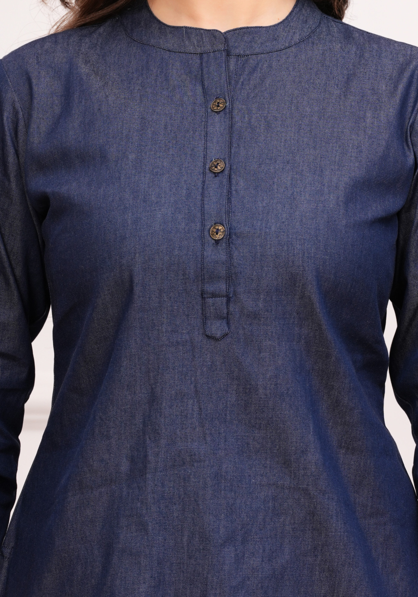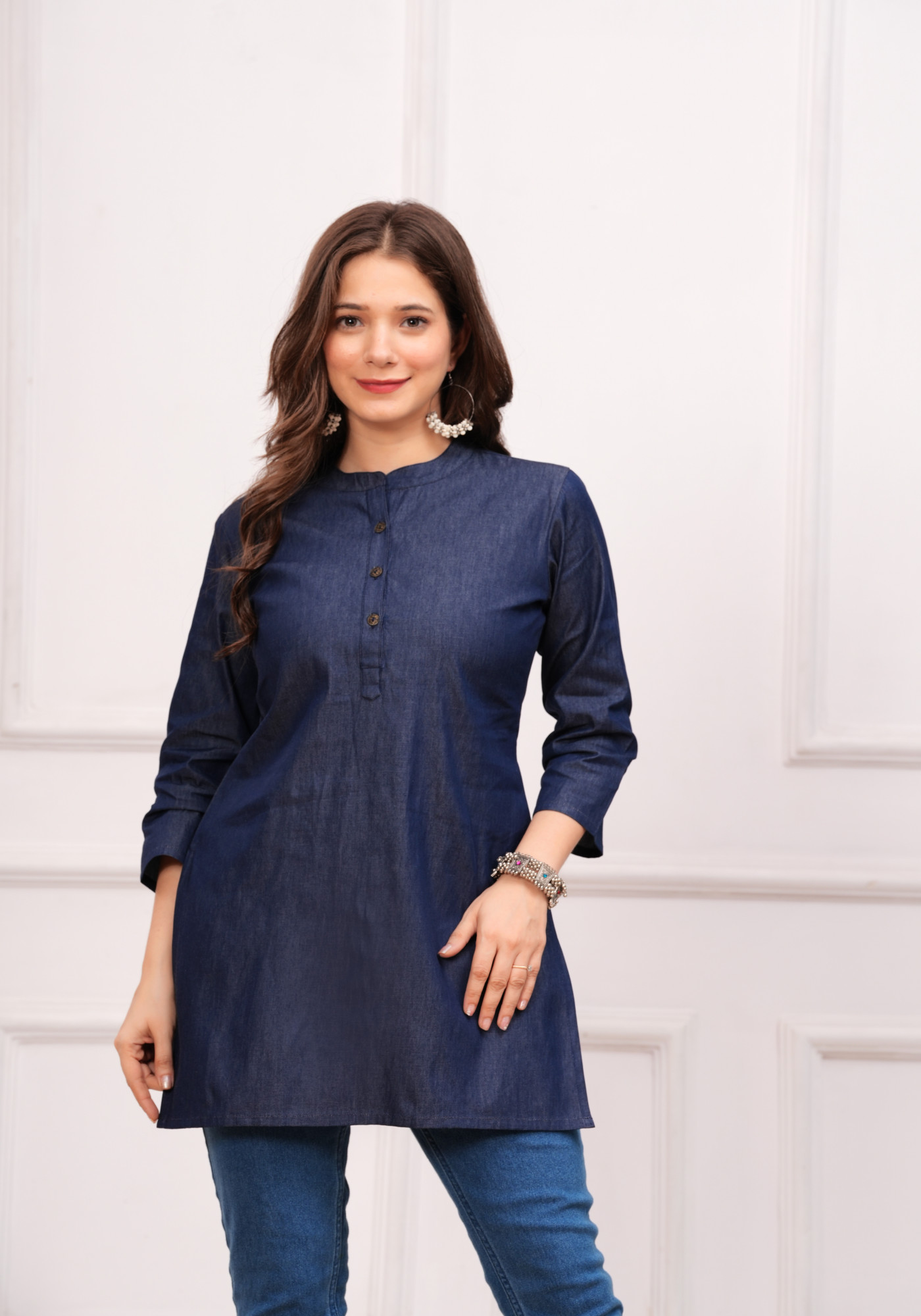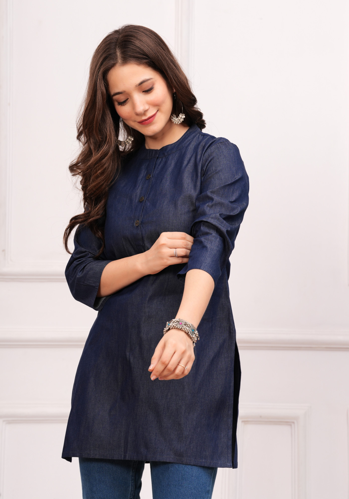Elevate your wardrobe with this elegant women's cotton blue straight top. Crafted from high-quality cotton fabric, making it perfect for all-day wear. The straight side slits design adds a touch of elegance and femininity. With a hip-length cut, stylish mandarin collar and 3/4th sleeves design makes it more elegant. This top features the solid pattern, elevates the overall aesthetic and lends a contemporary and trendy vibe to the top.