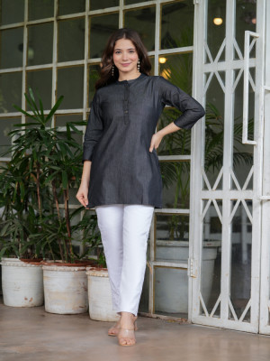 How to Style : Pair this denim top with tailored trousers or a pencil skirt or skinny jeans for a polished office look, or team it with jeans and flats for a laid-back yet chic ensemble.
