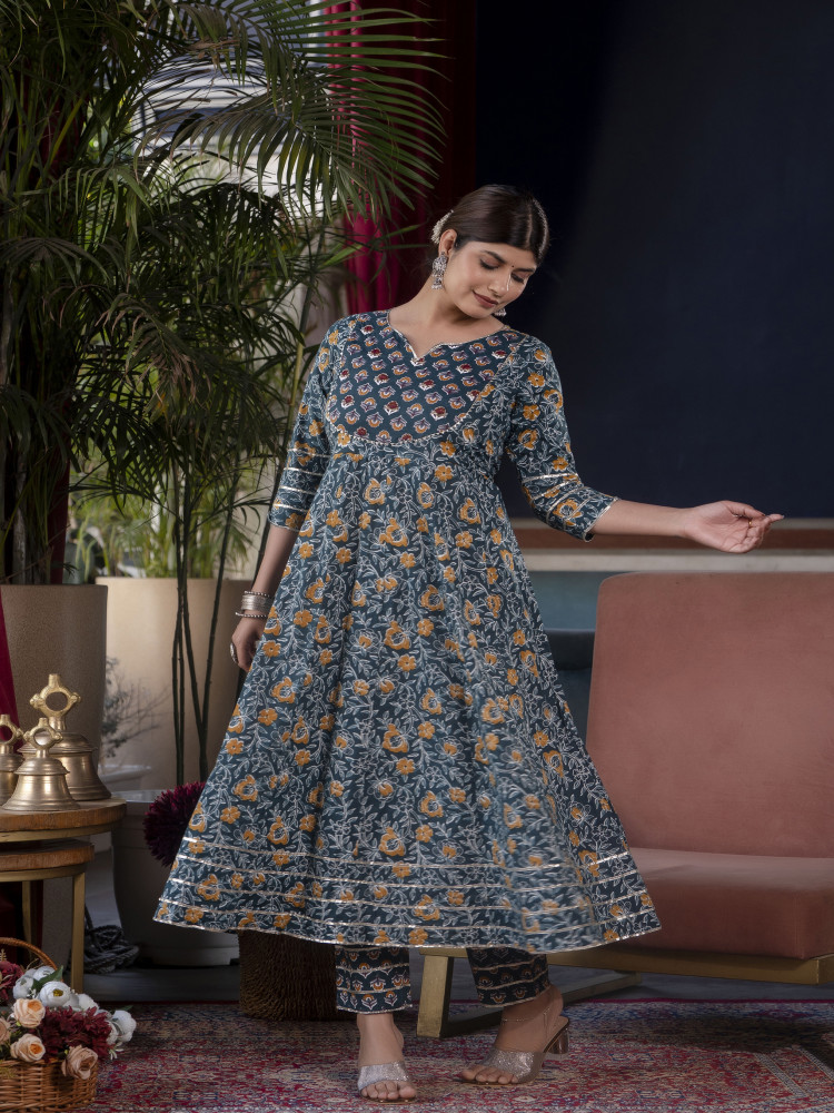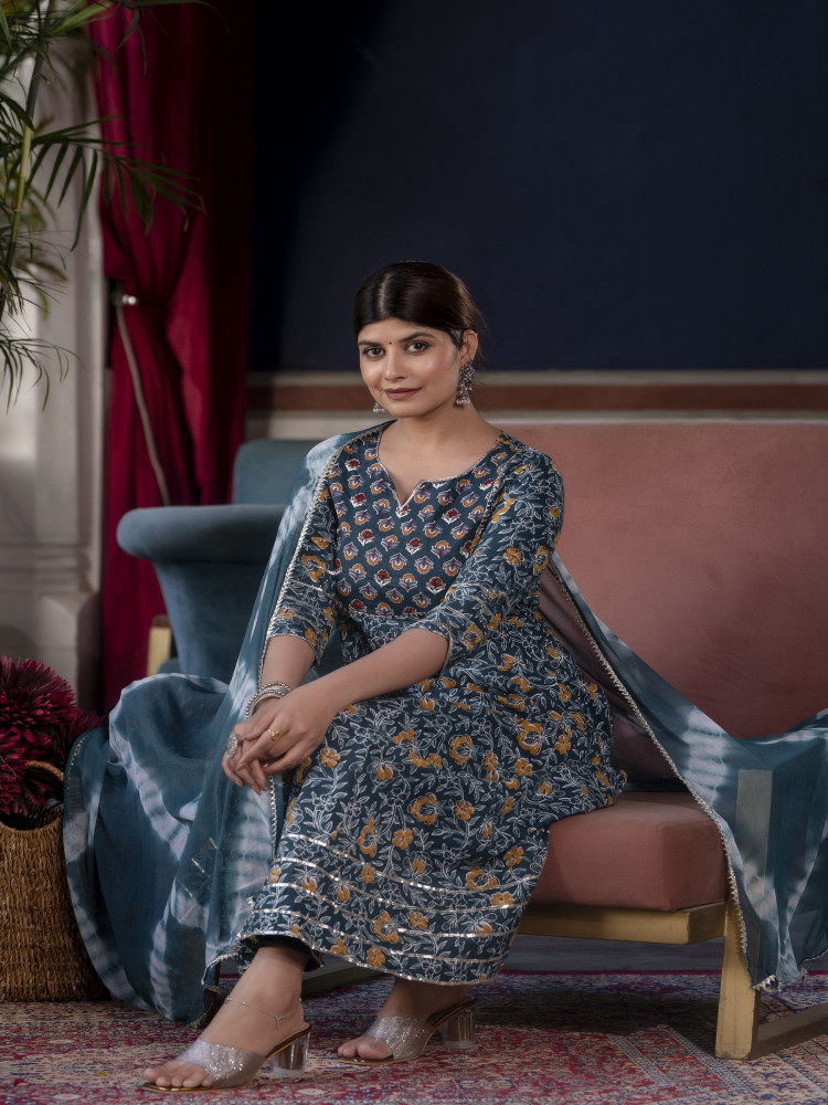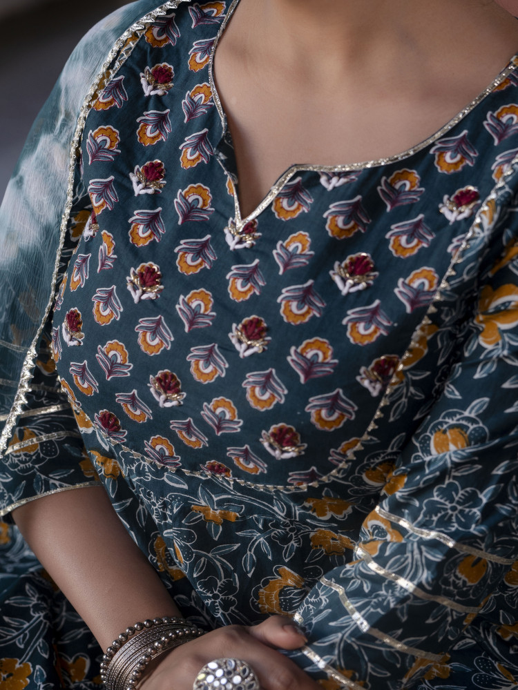 This Green Cotton Kurta and Pant set with Dupatta features Adda and Gotta handwork on the yoke, The Anarkali Kurta with work on yoke and Gotta lace work on the bottom of the Pant with Printed Dupatta, An ideal choice for wedding wear or special occasions.