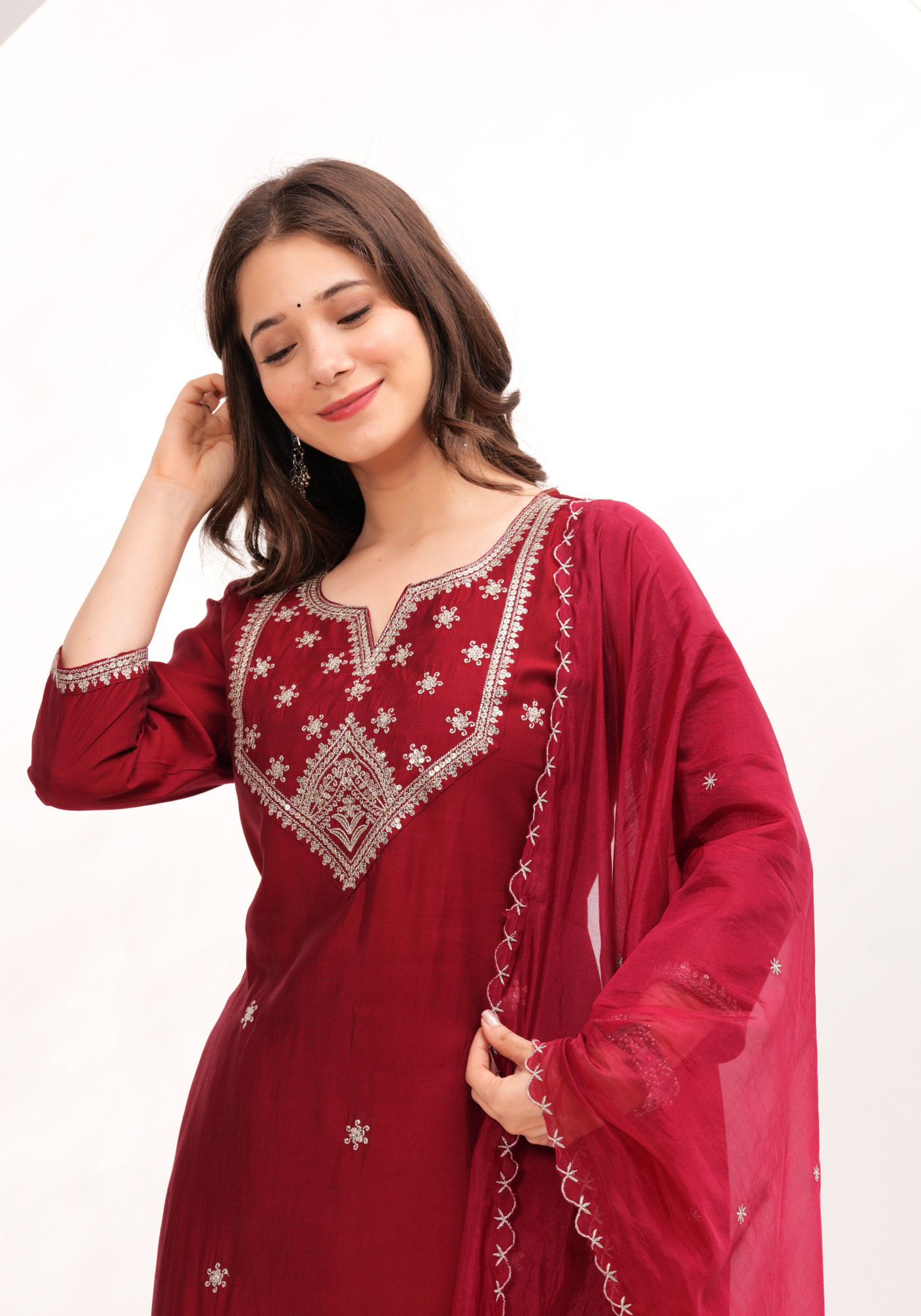 Where to Wear : This stylish kurta ensemble is great for festivals, family get together as well as weddings and formal events like parties! With its embroidery and exquisite dupatta design; it's a perfect choice, for special gatherings where you aim to leave a lasting impact.
