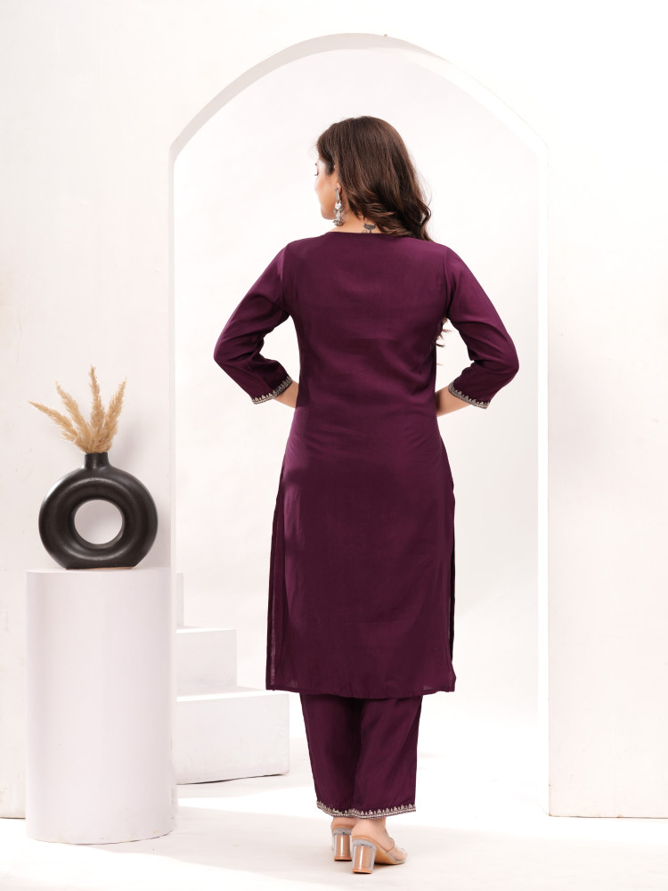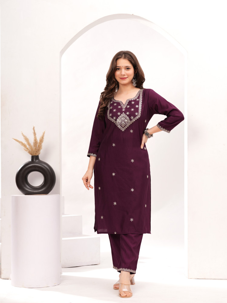 Enhance your clothing collection with this stylish women embroidered straight kurta set that includes a straight cut kurta adorned with detailed embroidery on the neckline and hemline paired with ankle length trousers featuring a handy pocket. The outfit is complemented by an embroidered dupatta for an extra touch of elegance. Ideal for events, gatherings and formal occasions this ensemble blends classic artistry, with contemporary flair to create a striking appearance.