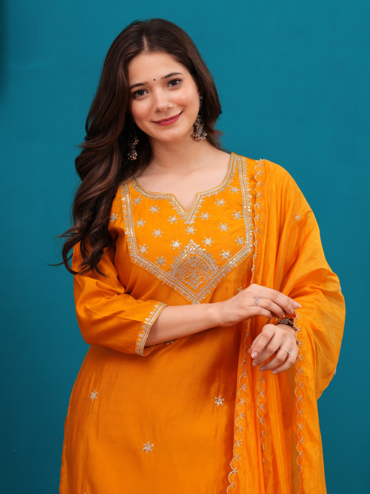 Where to Wear : This stylish kurta ensemble is great for festivals, family get together as well as weddings and formal events like parties! With its embroidery and exquisite dupatta design; it's a perfect choice, for special gatherings where you aim to leave a lasting impact.