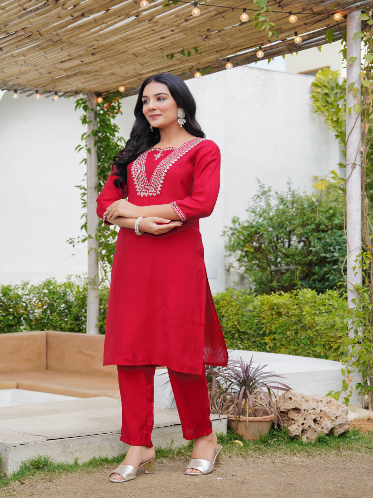 Enhance your clothing collection with this stylish women embroidered straight kurta set that includes a straight cut kurta adorned with detailed embroidery on the neckline and hemline paired with ankle length trousers featuring a handy pocket. The outfit is complemented by an embroidered dupatta for an extra touch of elegance. Ideal for events, gatherings and formal occasions this ensemble blends classic artistry, with contemporary flair to create a striking appearance.