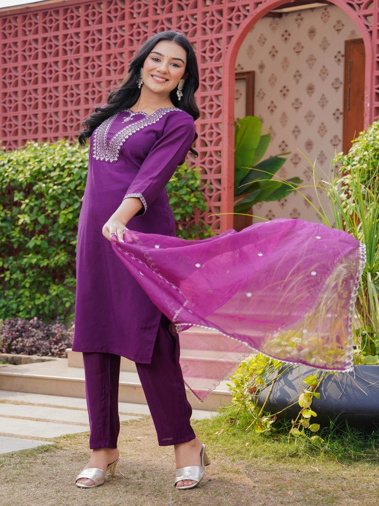 Enhance your clothing collection with this stylish women embroidered straight kurta set that includes a straight cut kurta adorned with detailed embroidery on the neckline and hemline paired with ankle length trousers featuring a handy pocket. The outfit is complemented by an embroidered dupatta for an extra touch of elegance. Ideal for events, gatherings and formal occasions this ensemble blends classic artistry, with contemporary flair to create a striking appearance.