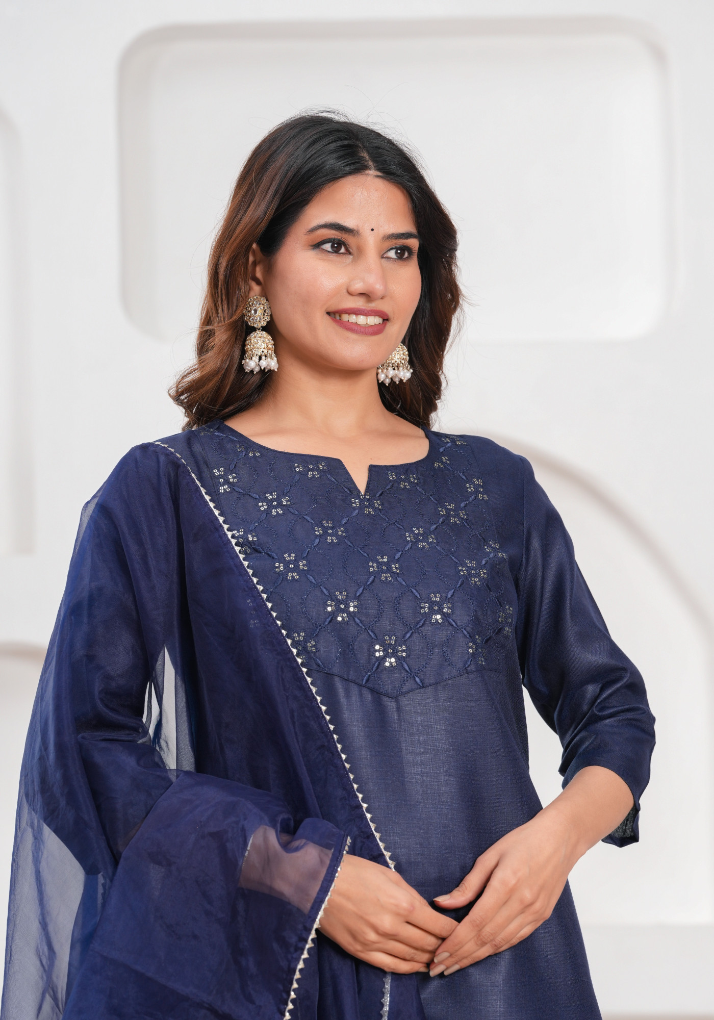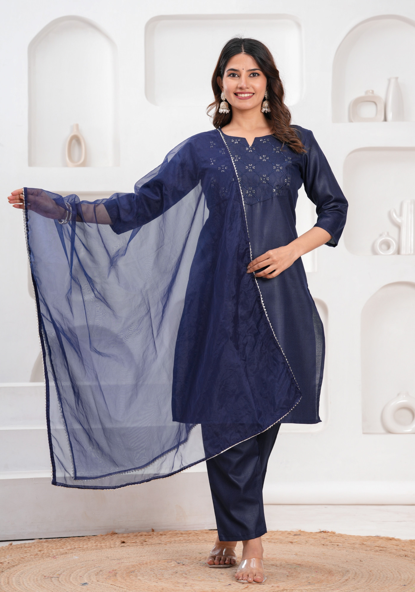 How to style - Pair it with minimal jewelry, such as studs or jhumkas, and opt for flats or juttis for a chic yet effortless look. The organza dupatta can be draped over one shoulder or styled as a front pallu for a graceful touch.