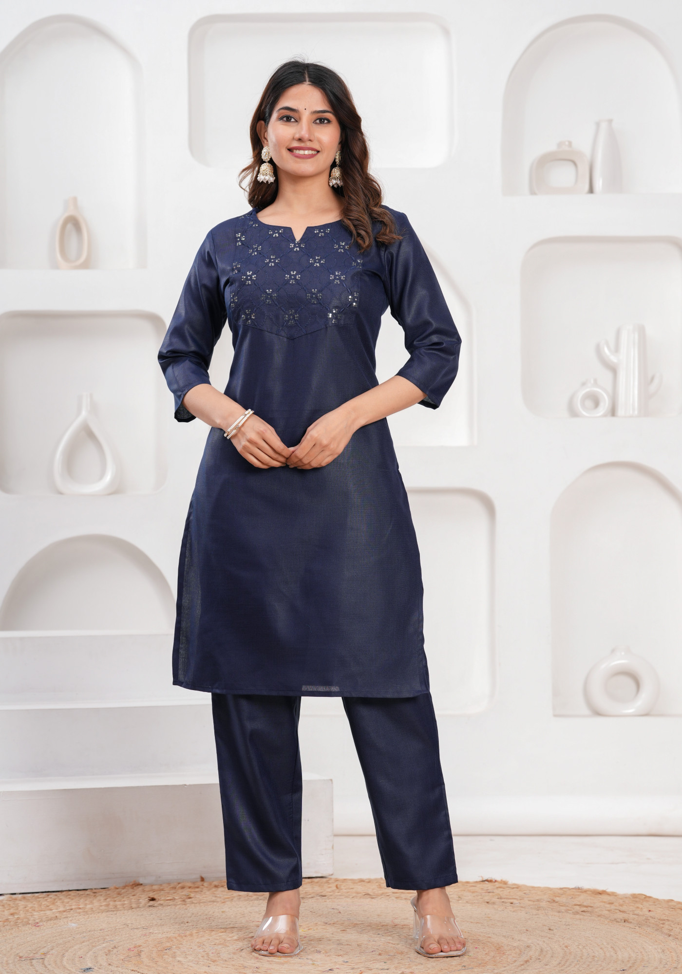 This elegant straight kurta pant and dupatta set is perfect for casual ethnic wear. The kurta features beautiful embroidery work on the yoke, adding a touch of grace. Made from a comfortable cotton blend fabric, it ensures breathability and ease of movement. The organza dupatta adds a subtle, lightweight charm to the ensemble. Designed with a round neckline and 3/4 regular sleeves, this outfit is ideal for effortless style and everyday elegance.