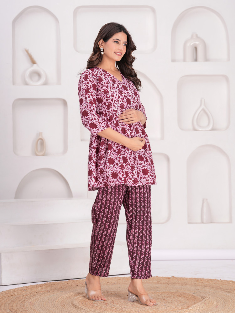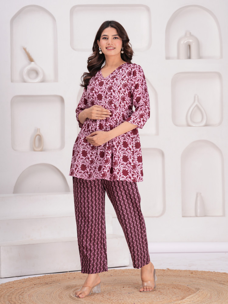 This Floral Printed Maternity Top and Pant Set Crafted from high-quality Cotton Blend fabric, providing optimal comfort throughout the day. Featuring both side concealed zips on the yoke, this set offers convenience and ease during maternity and nursing periods, allowing for effortless feeding access. The top is thoughtfully designed to accommodate the changing body shape, ensuring a flattering fit at every stage of pregnancy. Meanwhile, the drawstring waistband and one pocket on the pant provides adjustability and support.