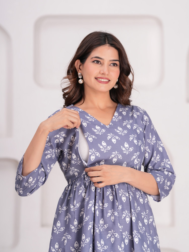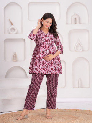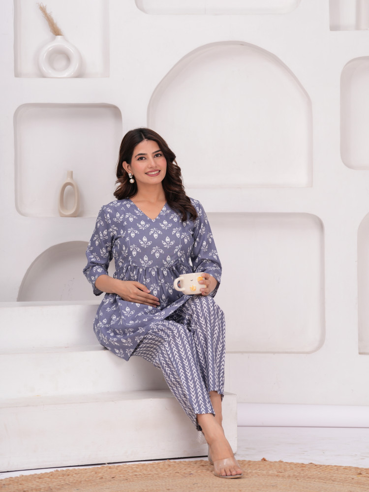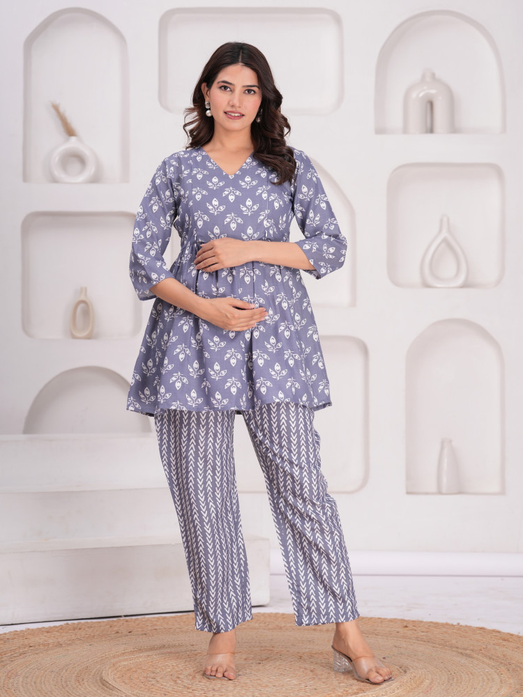 This Floral Printed Maternity Top and Pant Set Crafted from high-quality Cotton Blend fabric, providing optimal comfort throughout the day. Featuring both side concealed zips on the yoke, this set offers convenience and ease during maternity and nursing periods, allowing for effortless feeding access. The top is thoughtfully designed to accommodate the changing body shape, ensuring a flattering fit at every stage of pregnancy. Meanwhile, the drawstring waistband and one pocket on the pant provides adjustability and support.