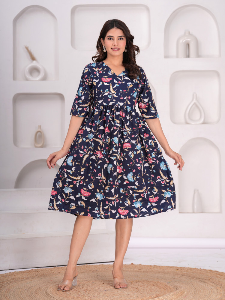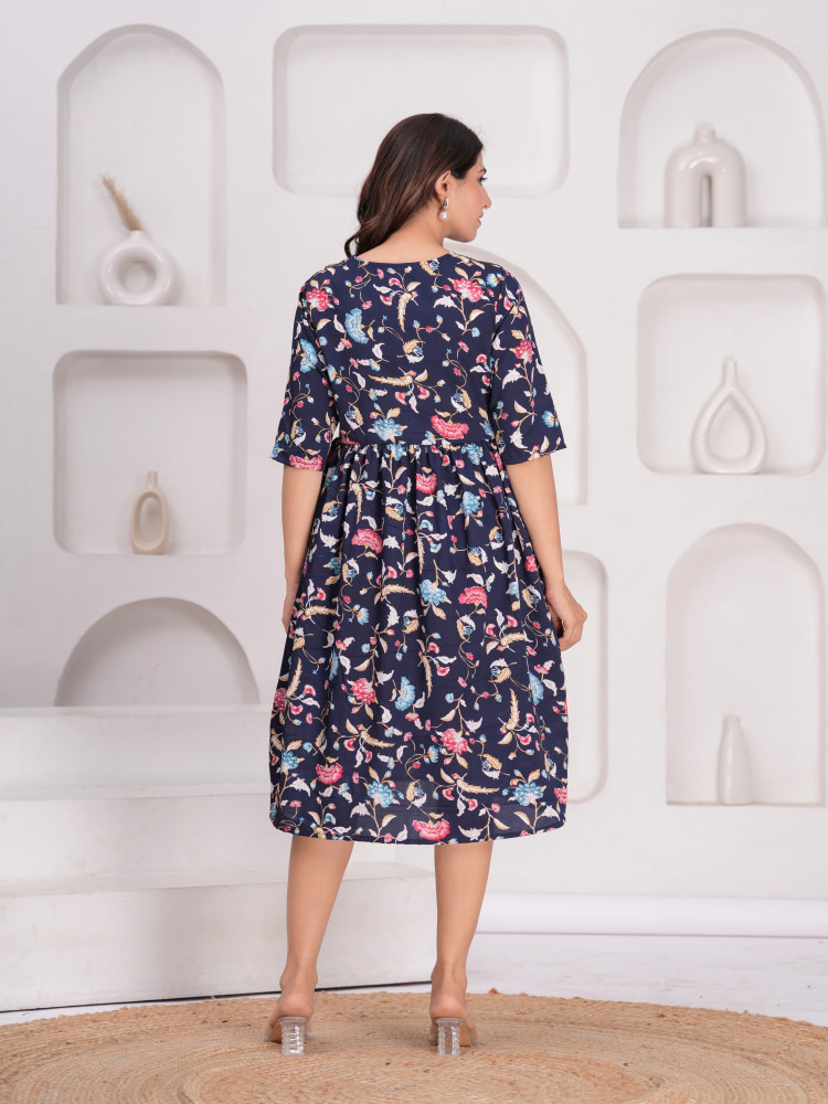 This  flared maternity and feeding kurta dress offers both comfort and style for moms-to-be. Designed with concealed zippers on both sides, it allows easy and discreet nursing access. The soft, breathable fabric ensures all-day comfort, perfect for pregnancy and postpartum wear. Adorned with a beautiful floral print, it adds a touch of elegance to your maternity wardrobe.