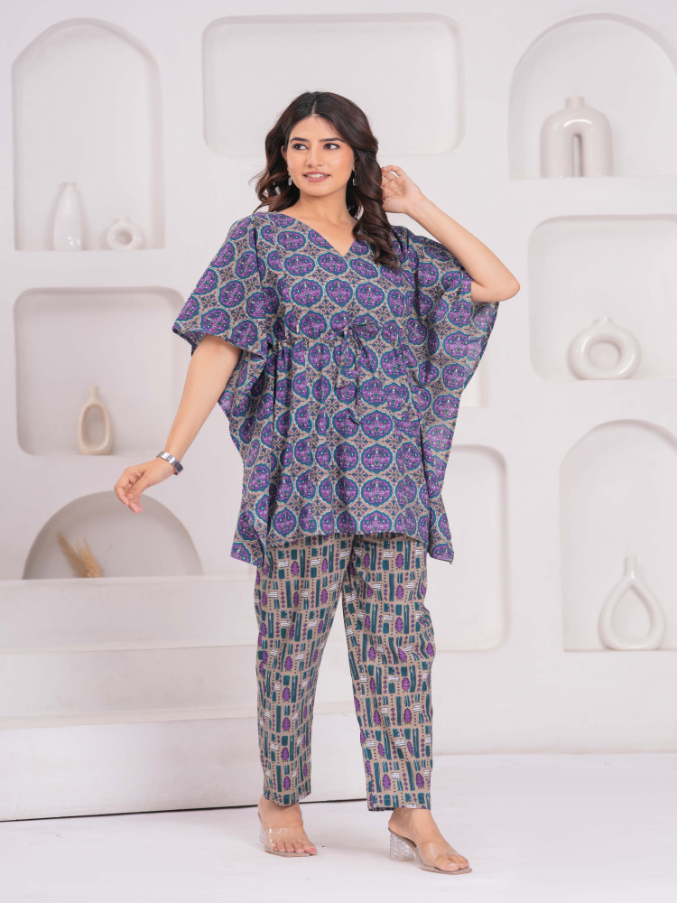 Stay stylish and comfortable during pregnancy with this women’s floral maternity kaftan set. Crafted from soft, breathable cotton fabric, the set includes a flowy kaftan top with a flattering V-neckline and a relaxed fit. The kaftan features both-side concealed zippers for easy nursing access, while the matching pants come with a drawstring waistband for an adjustable fit and a handy pocket for convenience. Perfect for lounging or casual outings, this set blends comfort with effortless maternity style.