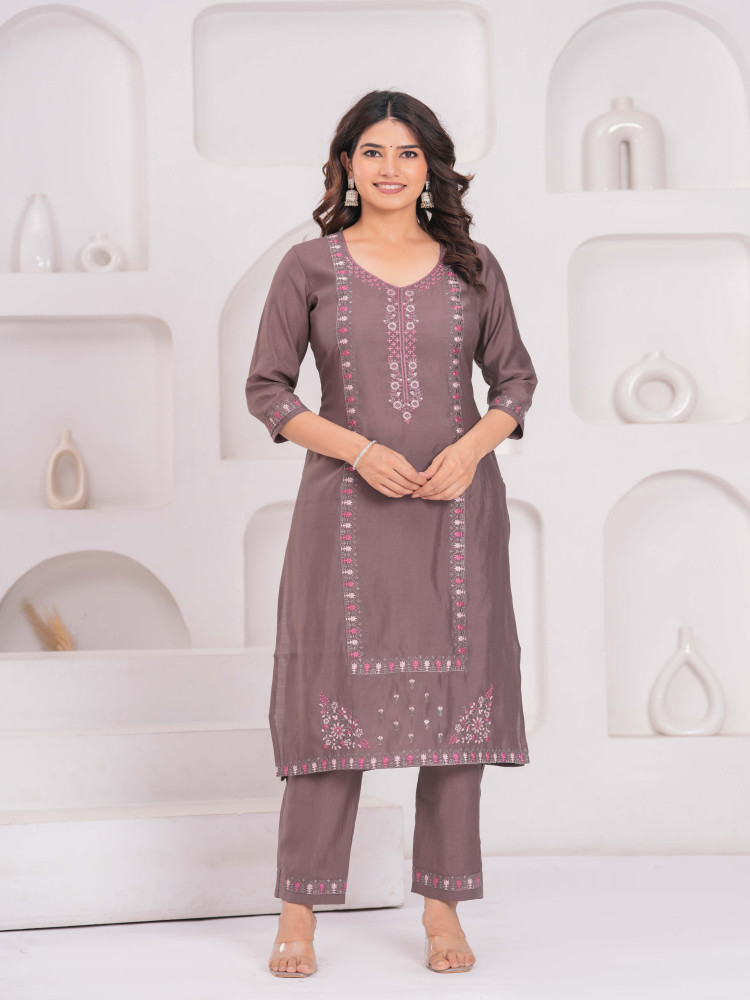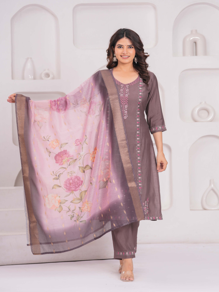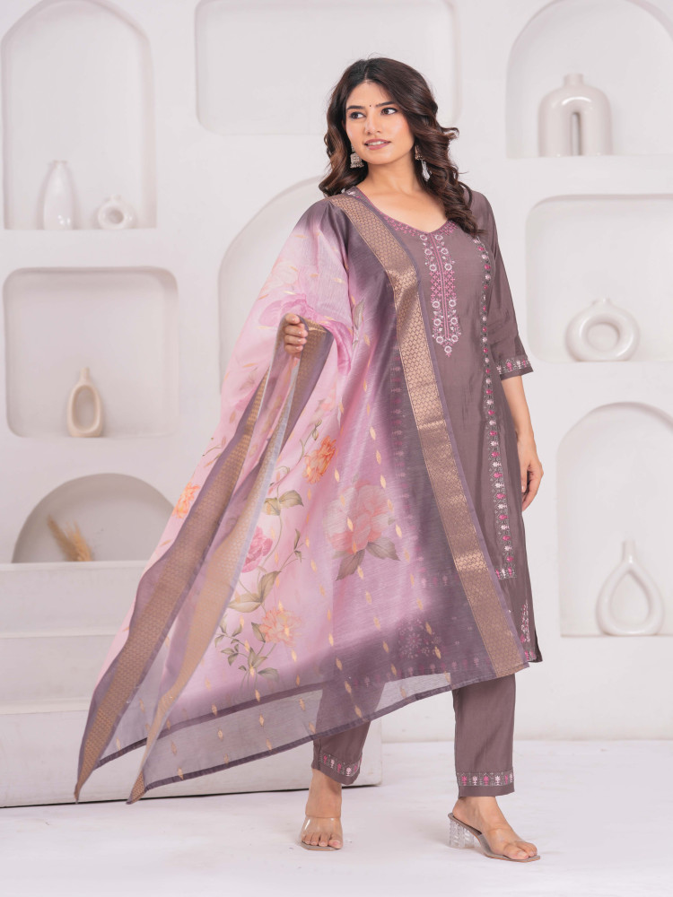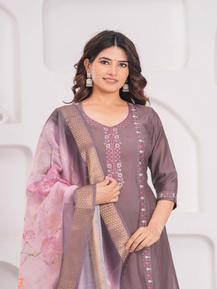 Enhance your clothing collection with this stylish women silk blend embroidered straight kurta set that includes a straight cut kurta adorned with detailed embroidery all over and hemline paired with ankle length trousers featuring a handy pocket. The outfit is complemented by beautiful printed organza dupatta for an extra touch of elegance. Ideal for events, gatherings and formal occasions this ensemble blends classic artistry, with contemporary flair to create a striking appearance.