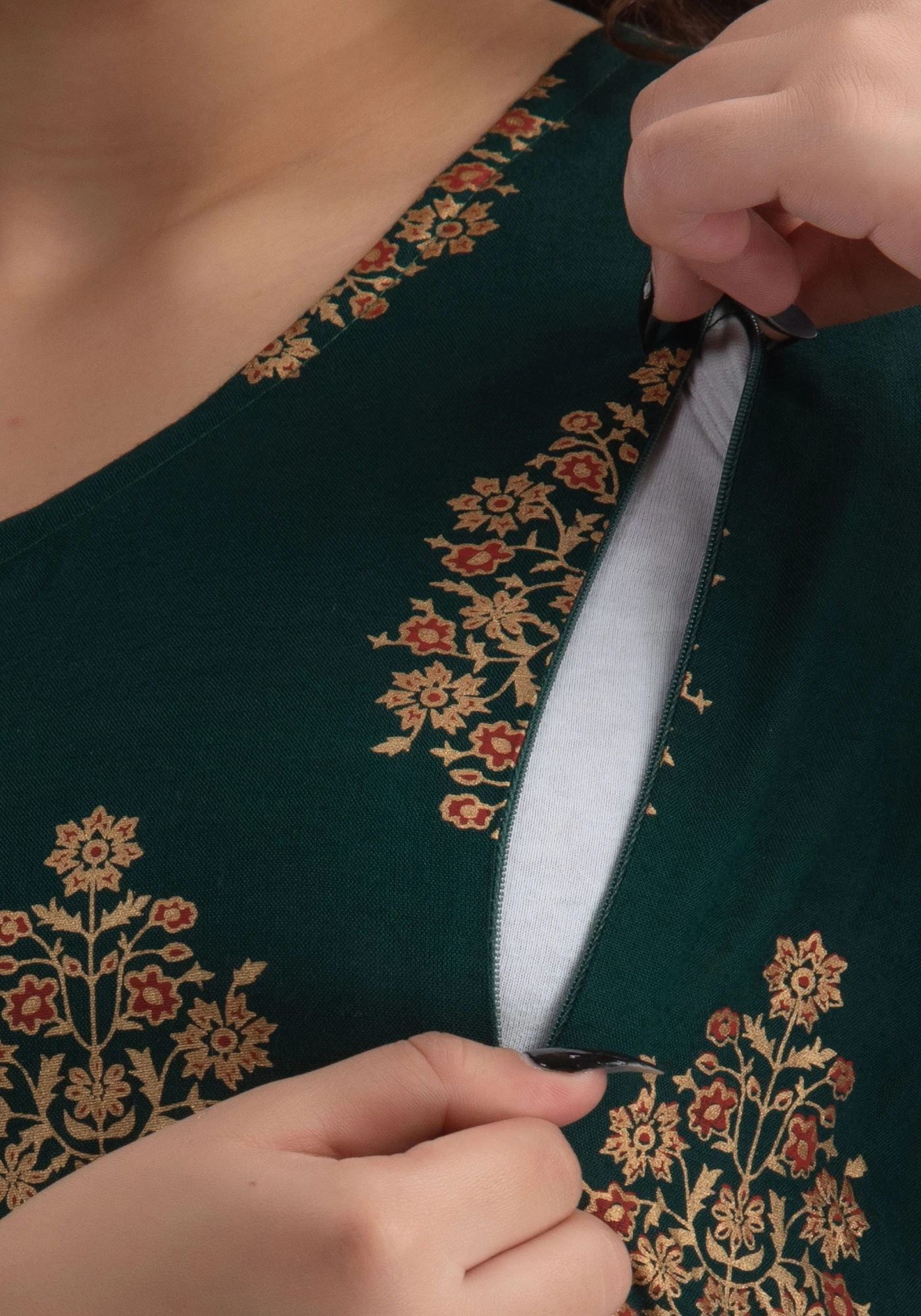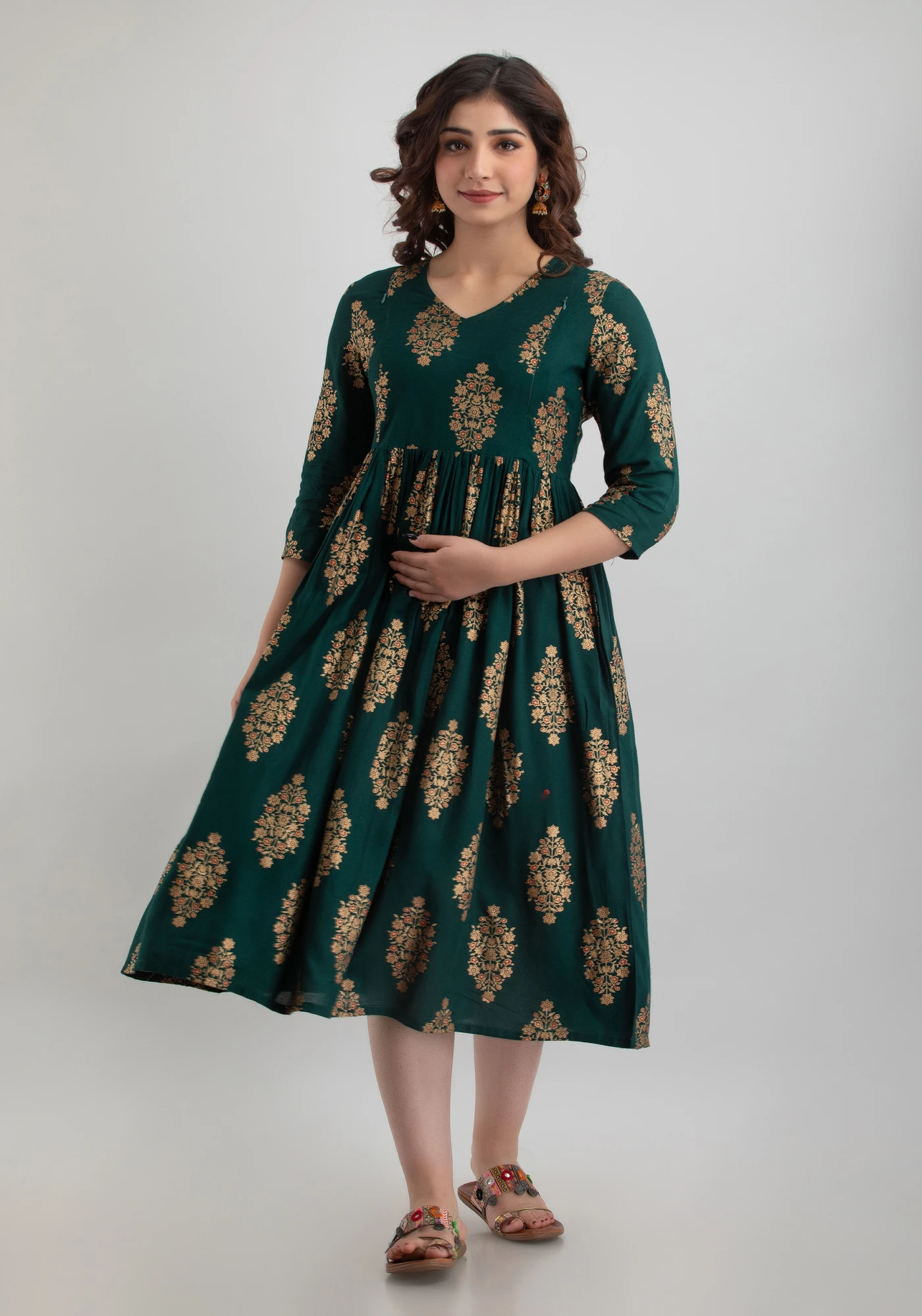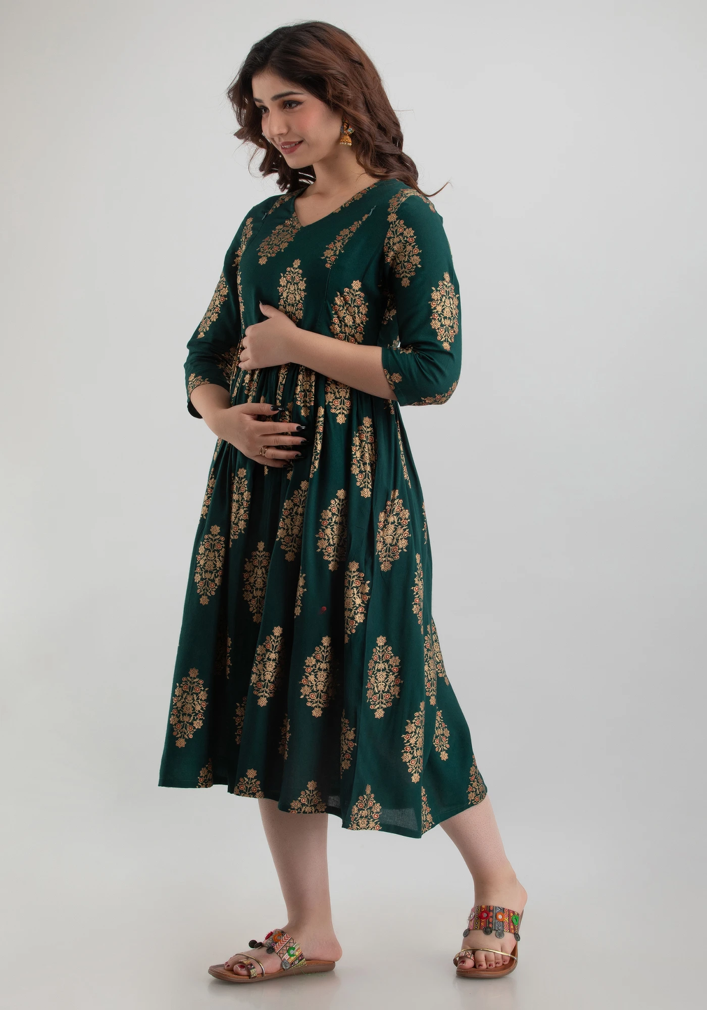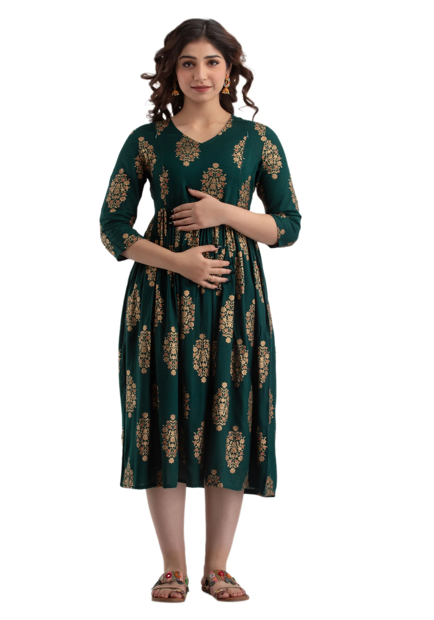Stylish Fabulous Printed Flared Women Maternity Wear Printed Dress by Celebravo with both side having zipper. The Feeding top has been designed uniquely plats around tummy area to hide Pre and Post Pregnancy baby bump beautifully. This Gown Style Western Dress is lightweight, breathable, stretchy & incredibly soft to the skin.