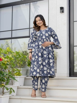 This Floral Printed Maternity Kurta and Pant Set Crafted from high-quality Cotton Blend fabric, providing optimal comfort throughout the day. Featuring both side concealed zips on the yoke and lace detailing all over. This set offers convenience and ease during maternity and nursing periods, allowing for effortless feeding access. The top is thoughtfully designed to accommodate the changing body shape, ensuring a flattering fit at every stage of pregnancy. Meanwhile, the drawstring waistband and one pocket on the pant provides adjustability and support.