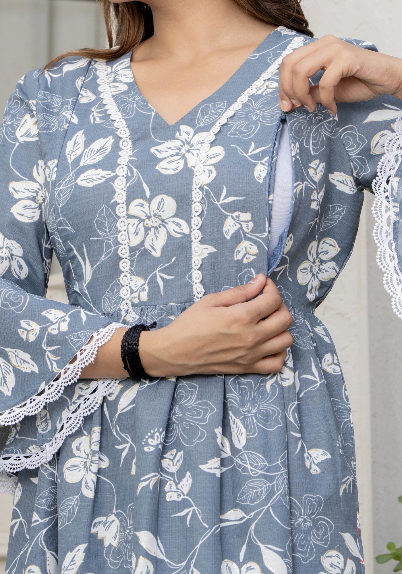 This Floral Printed Maternity Kurta and Pant Set Crafted from high-quality Cotton Blend fabric, providing optimal comfort throughout the day. Featuring both side concealed zips on the yoke and lace detailing all over. This set offers convenience and ease during maternity and nursing periods, allowing for effortless feeding access. The top is thoughtfully designed to accommodate the changing body shape, ensuring a flattering fit at every stage of pregnancy. Meanwhile, the drawstring waistband and one pocket on the pant provides adjustability and support.