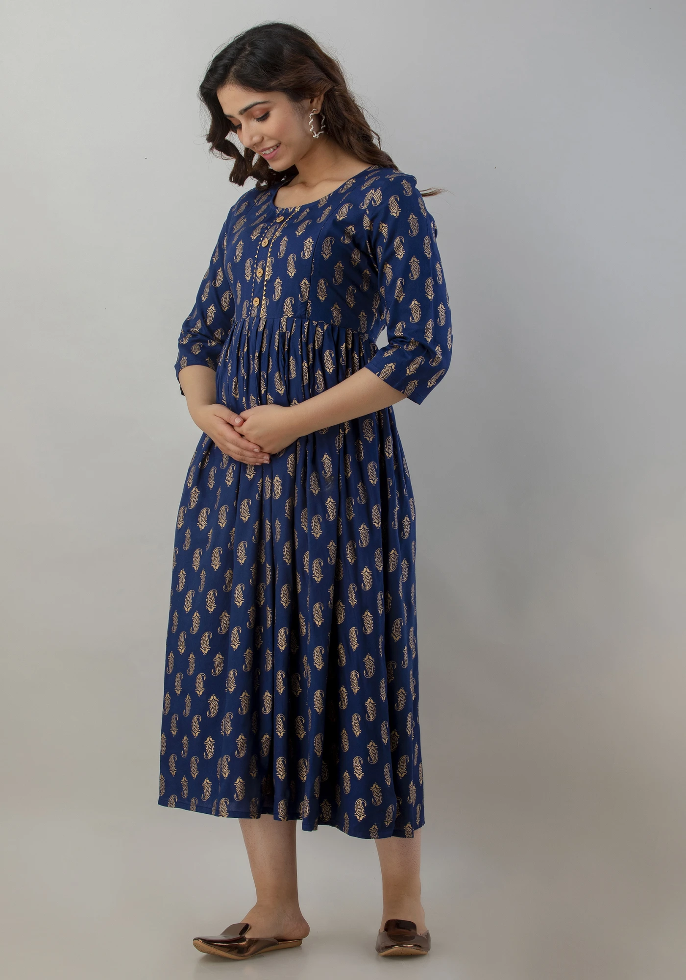 Pair this maternity western gown with soft leggings or wear it as a standalone flared dress. Add minimal earrings or studs and comfortable flats for a chic yet effortless maternity look.