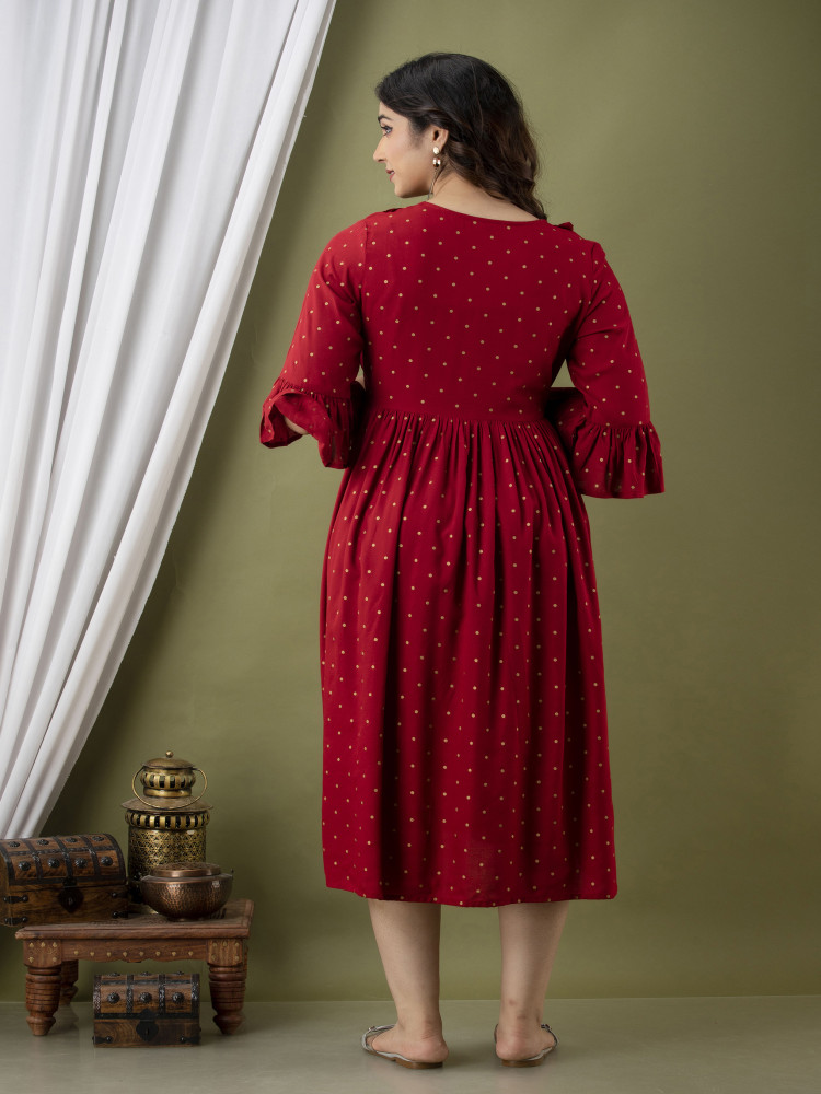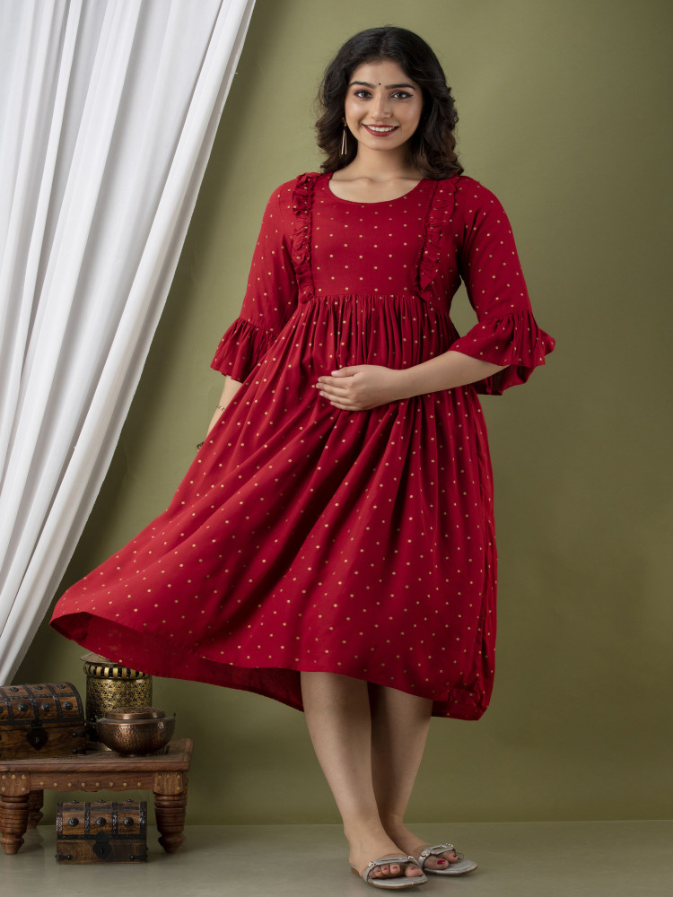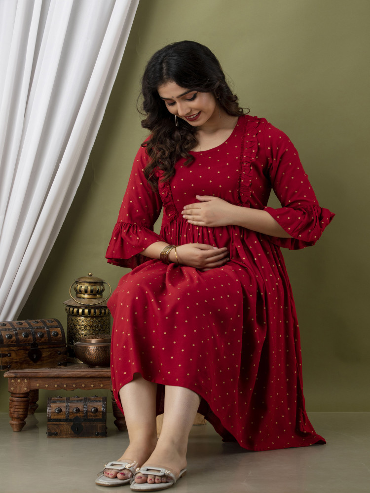 Add timeless charm to your maternity wardrobe with this polka printed maternity and feeding dress crafted from soft, breathable rayon fabric. Designed for both pregnancy and postpartum comfort, this elegant dress combines style with everyday practicality.