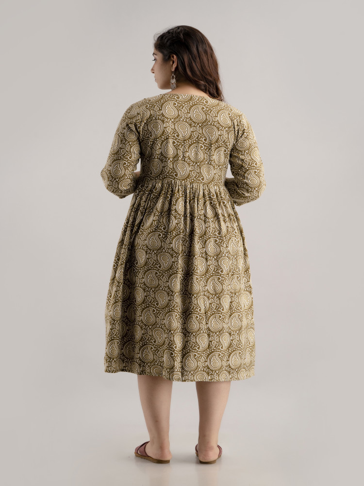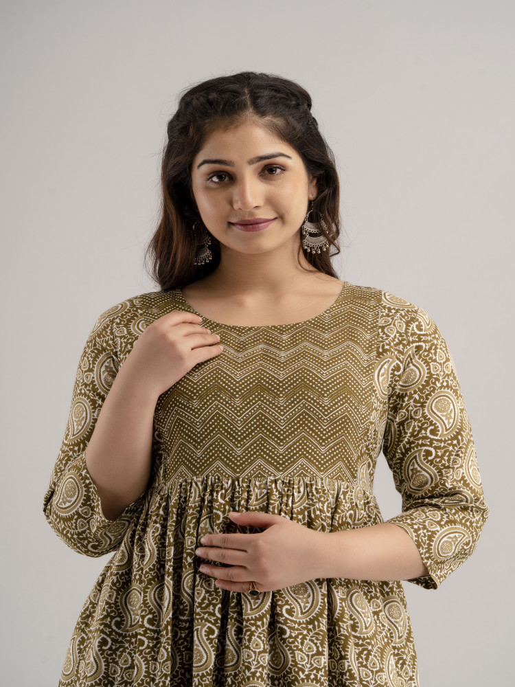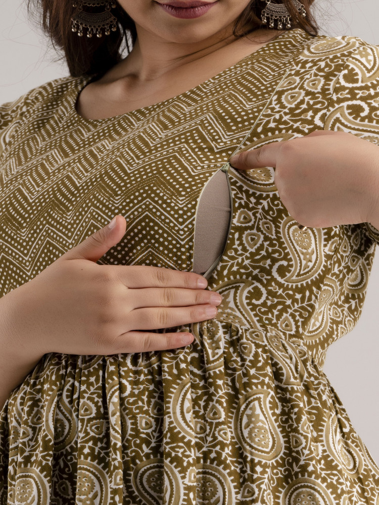 This Paisley Printed Flared Maternity and Feeding Kurta Dress is designed for both style and comfort. Made from soft Rayon fabric, it features a Round neckline and regular 3/4 sleeves for a chic look. The flared silhouette ensures a relaxed fit, perfect for casual wear. Concealed zippers on both sides provide easy nursing access for feeding convenience. A trendy Paisley print pattern adds a fashionable touch to your maternity wardrobe.
