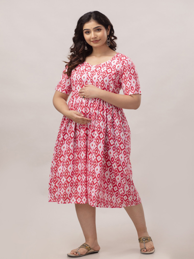 The trendy Ikat print adds a touch of ethnic charm, making this maternity dress perfect for daily wear and casual outings.
