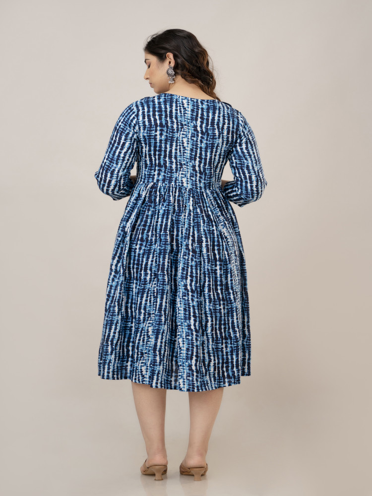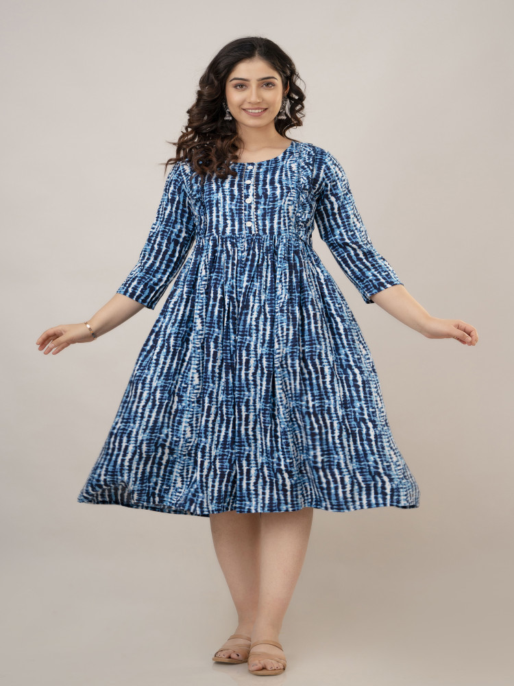 This Tie-dye Printed Flared Maternity and Feeding Kurta Dress is designed for both style and comfort. Made from soft Rayon fabric, it features a Round neckline and regular 3/4th sleeves for a chic look. The flared silhouette ensures a relaxed fit, perfect for casual wear. Concealed zippers on both sides provide easy nursing access for feeding convenience. A trendy tie-dye print pattern adds a fashionable touch to your maternity wardrobe.
