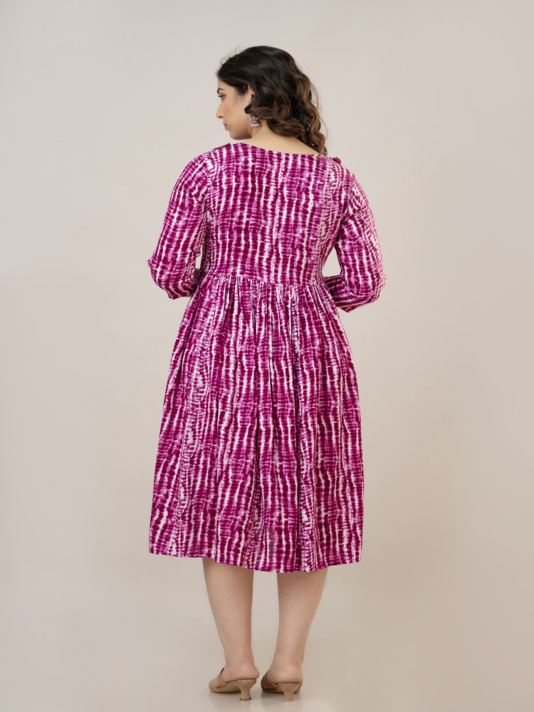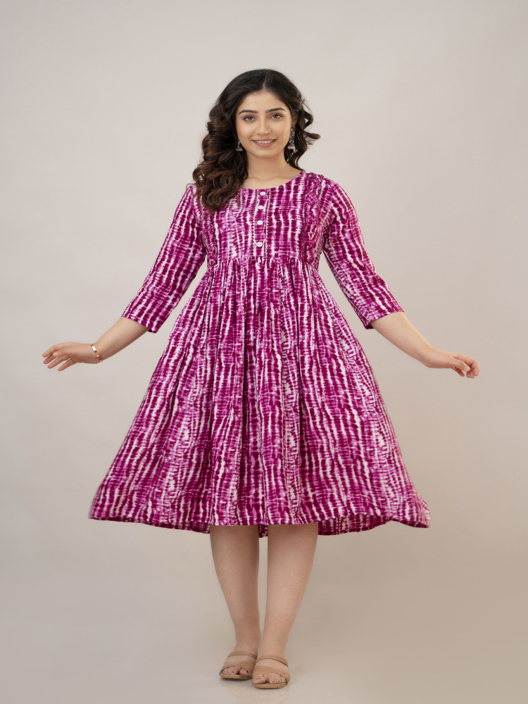 This Tie-dye Printed Flared Maternity and Feeding Kurta Dress is designed for both style and comfort. Made from soft Rayon fabric, it features a Round neckline and regular 3/4th sleeves for a chic look. The flared silhouette ensures a relaxed fit, perfect for casual wear. Concealed zippers on both sides provide easy nursing access for feeding convenience. A trendy tie-dye print pattern adds a fashionable touch to your maternity wardrobe.