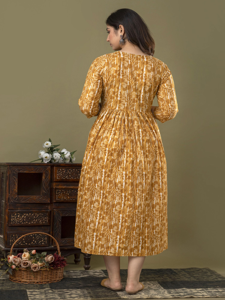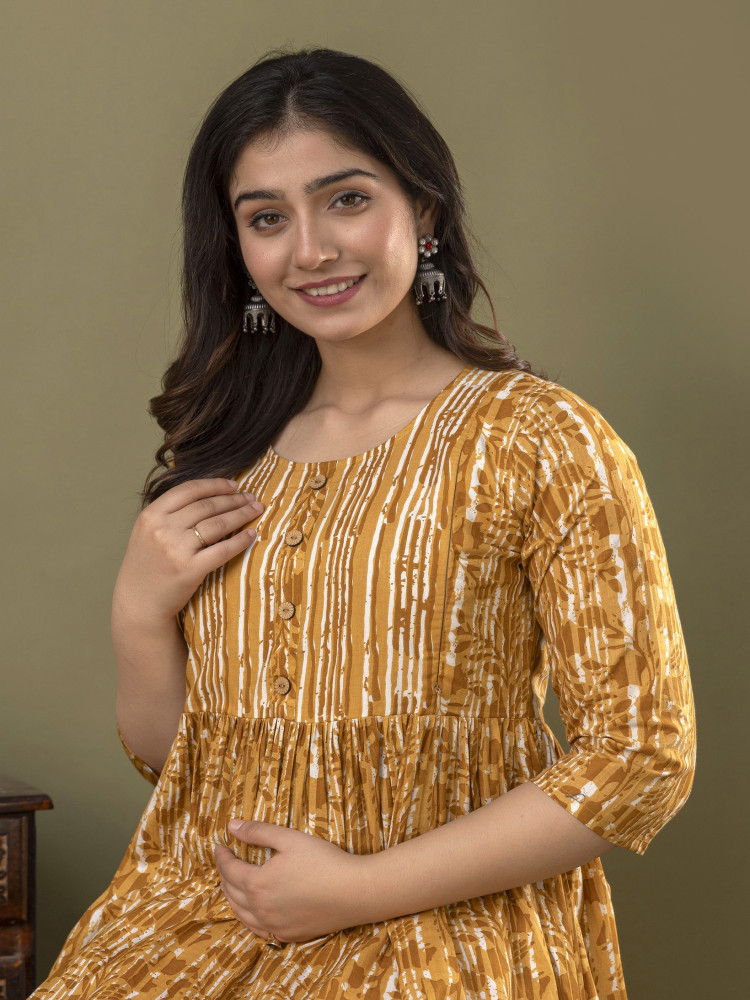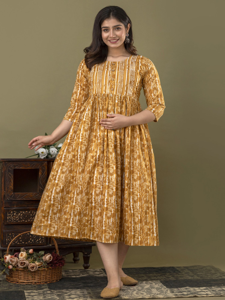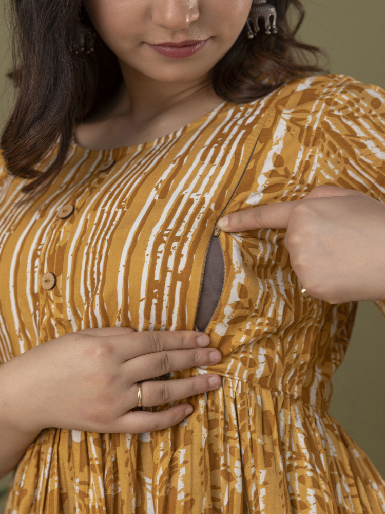 This pure cotton flared maternity and feeding kurta dress offers both comfort and style for moms-to-be. Designed with concealed zippers on both sides, it allows easy and discreet nursing access. The soft, breathable fabric ensures all-day comfort, perfect for pregnancy and postpartum wear. Adorned with a beautiful floral print, it adds a touch of elegance to your maternity wardrobe.