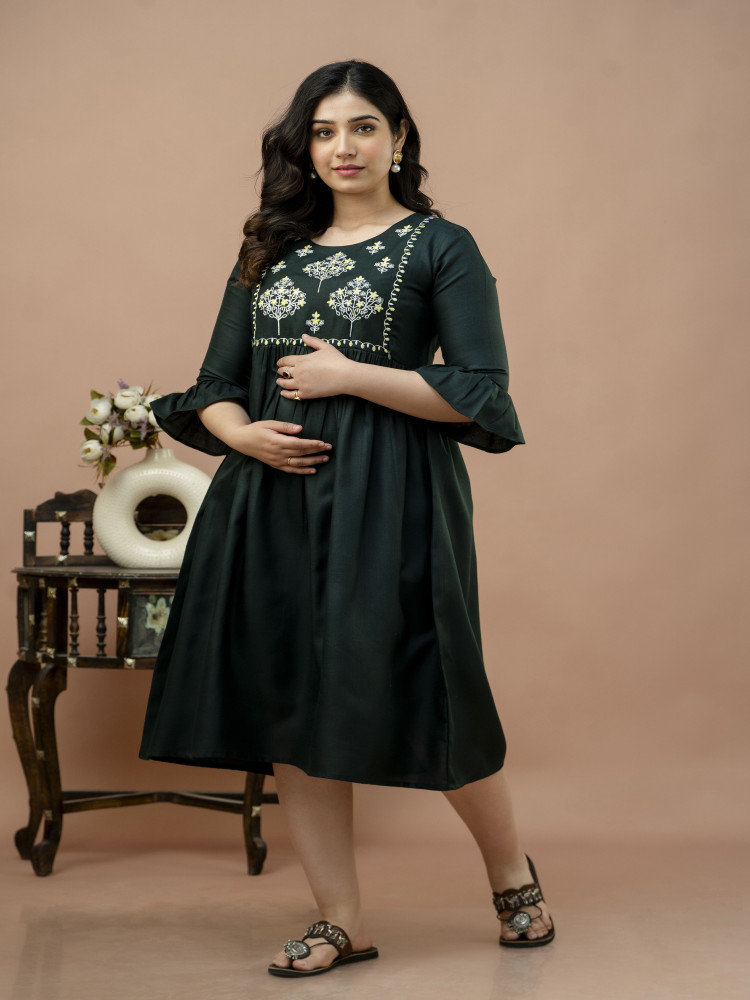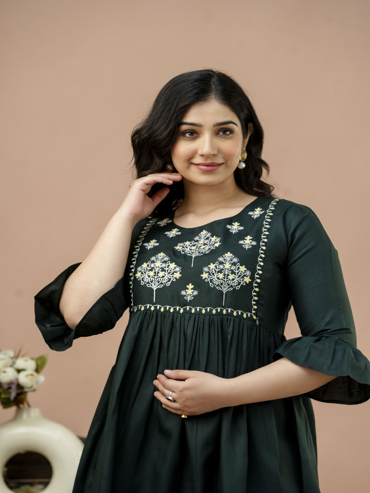 Style yourself with our Flared Embroidery maternity and feeding kurta. Crafted from cotton blend, it offers breathability and softness for both you and your baby. Effortlessly transition from maternity to nursing with its thoughtful design. This kurta comes with embroidery work on yoke and both side concealed zippers for easy breastfeeding.