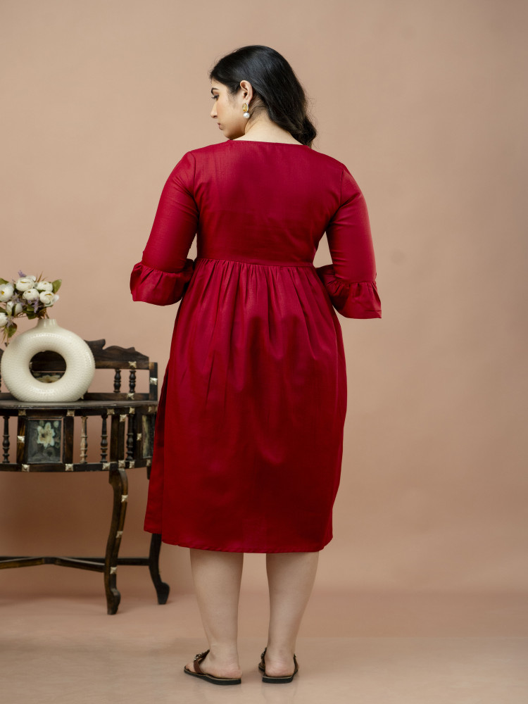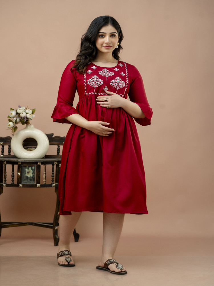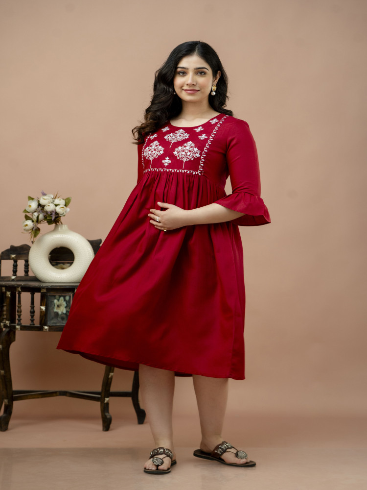Style yourself with our Flared Embroidery maternity and feeding kurta. Crafted from cotton blend, it offers breathability and softness for both you and your baby. Effortlessly transition from maternity to nursing with its thoughtful design. This kurta comes with embroidery work on yoke and both side concealed zippers for easy breastfeeding.