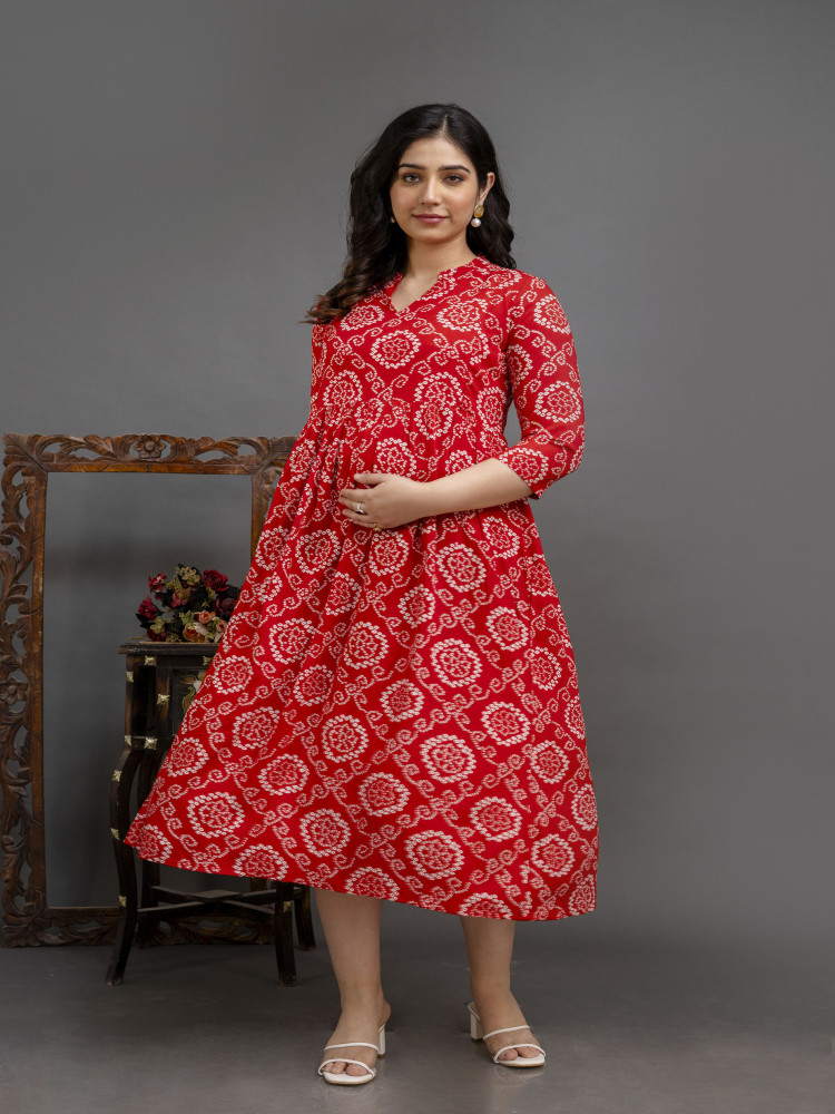 This Rayon Bandhani-printed maternity and feeding kurta offers both comfort and style. This feeding dress is designed with 3/4 regular sleeves, mandarin collar with concealed zippers both side for easy breasfeeding. The soft, breathable fabric ensures a relaxed fit for pregnancy and beyond. Its elegant print adds a graceful touch to your wardrobe. Perfect for both maternity wear, ensuring long-term usability.
