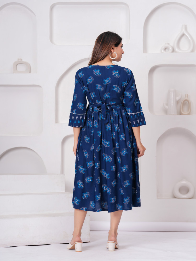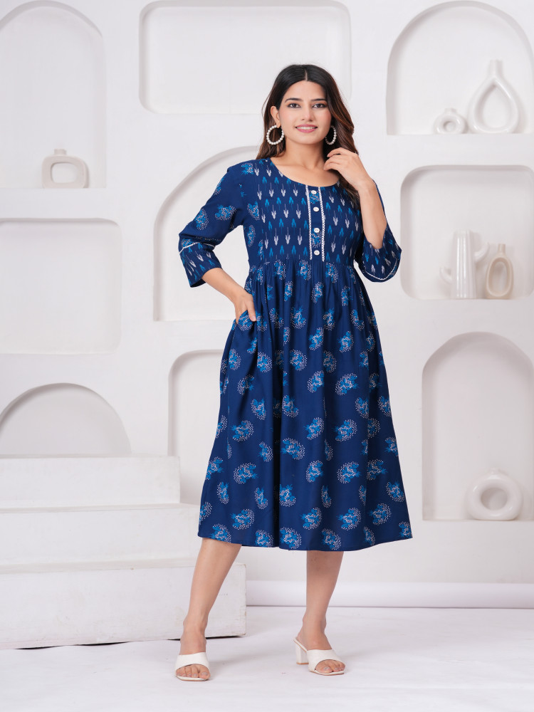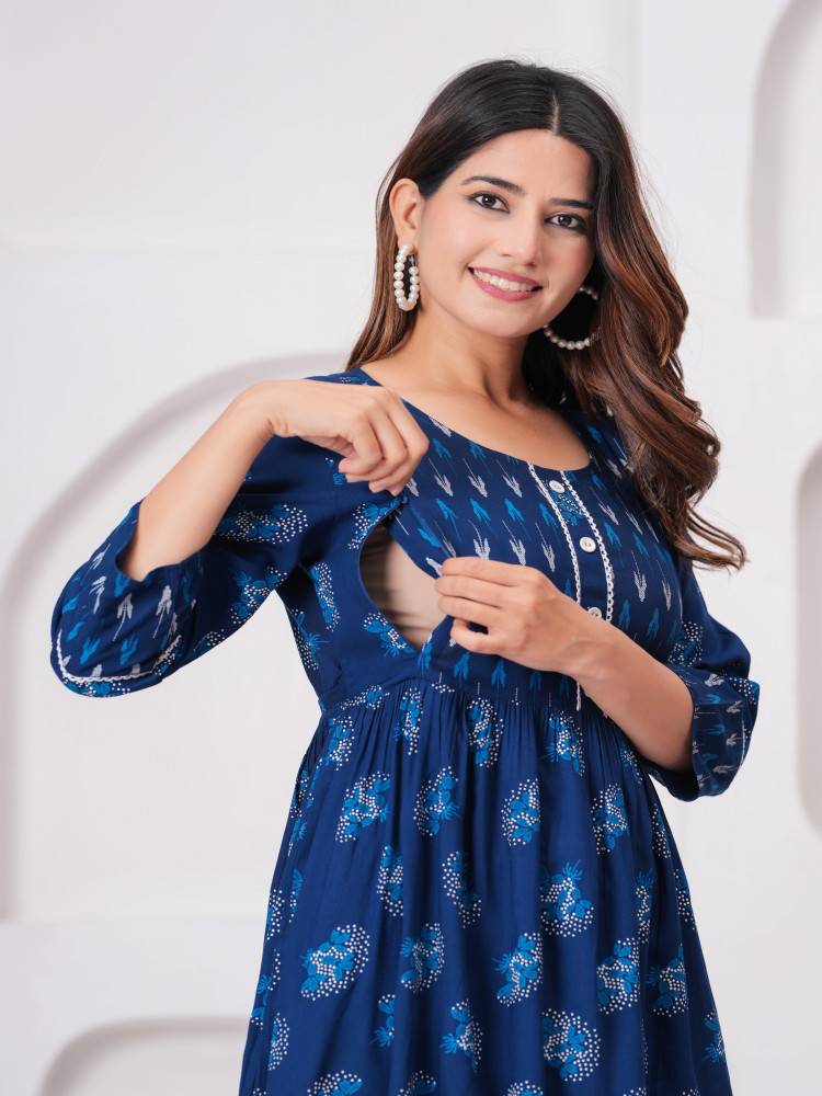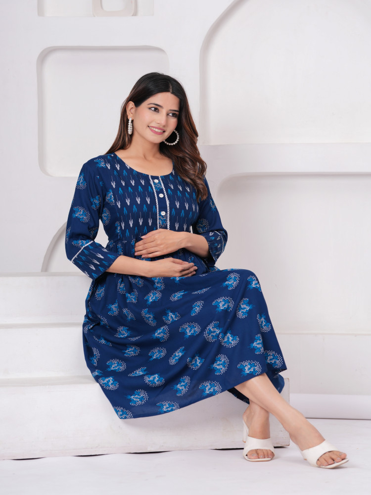 This Floral Printed Flared Maternity and Feeding Kurta Dress is designed for both style and comfort. Made from soft Rayon fabric, it features a V neckline and 3/4 Regular sleeves for a chic look. The flared silhouette ensures a relaxed fit, perfect for casual wear. Concealed zippers on both sides, Dori in back to adjust according to your waist and Both side pockets provide easy nursing access for feeding convenience. A trendy floral print pattern adds a fashionable touch to your maternity wardrobe.