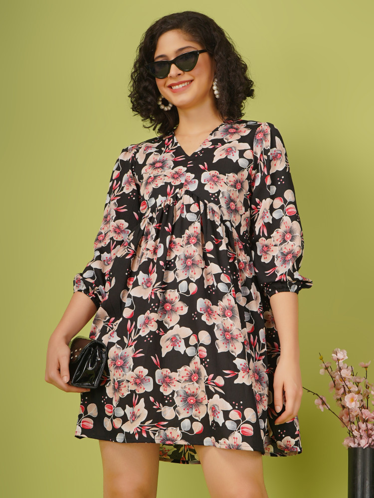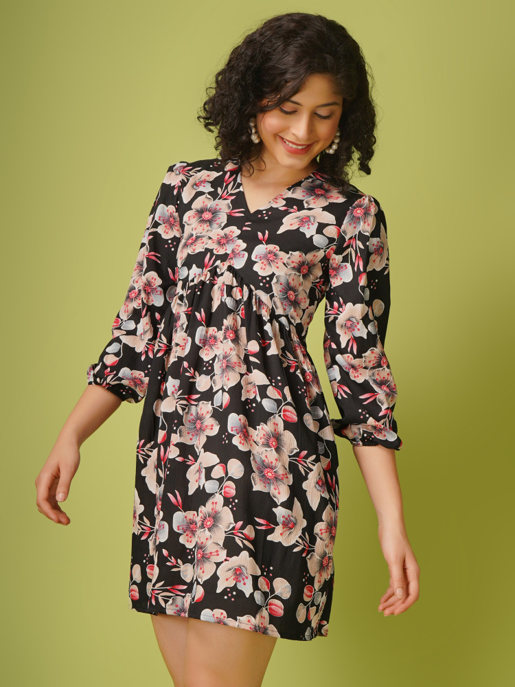 Stay classy and stylish with this Women's Pretty Floral Printed Fit and Flare Partywear one piece Dress. Featuring an attractive design, this partywear dress is designed above the knee with V Neckline and full length elasticated sleeves, giving you a beautiful fit and flare Look.