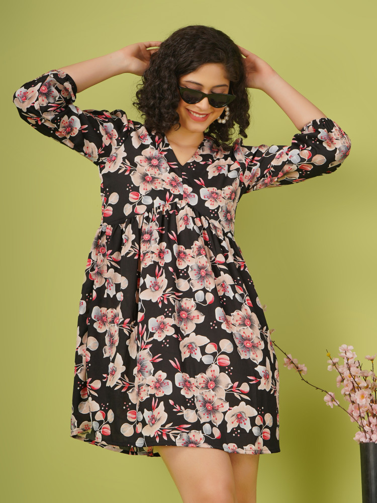 Black Floral Casual Midi Dress