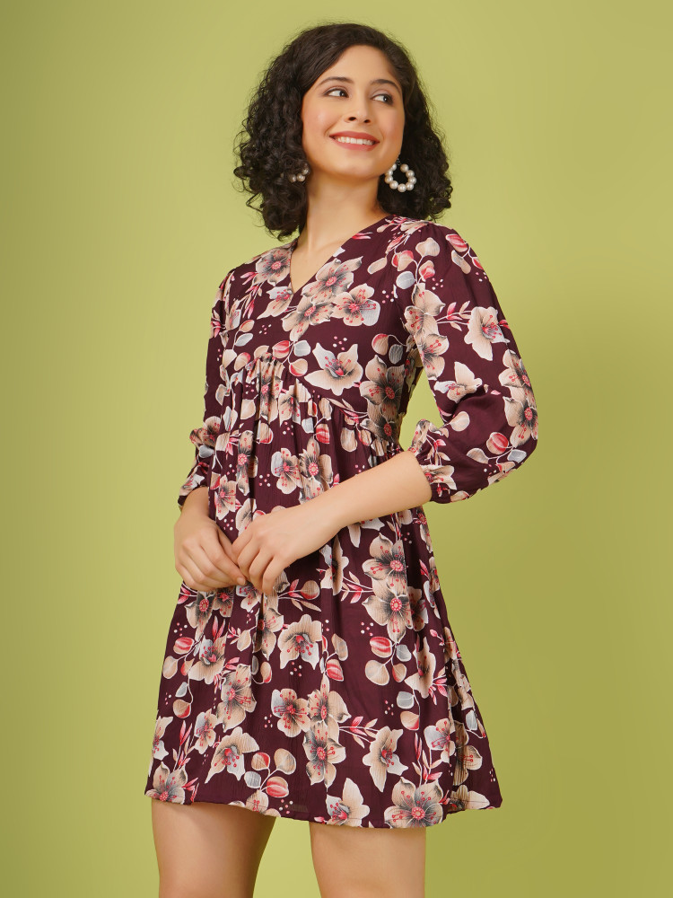 Stay classy and stylish with this Women's Pretty Floral Printed Fit and Flare Partywear one piece Dress. Featuring an attractive design, this partywear dress is designed above the knee with V Neckline and full length elasticated sleeves, giving you a beautiful fit and flare Look.