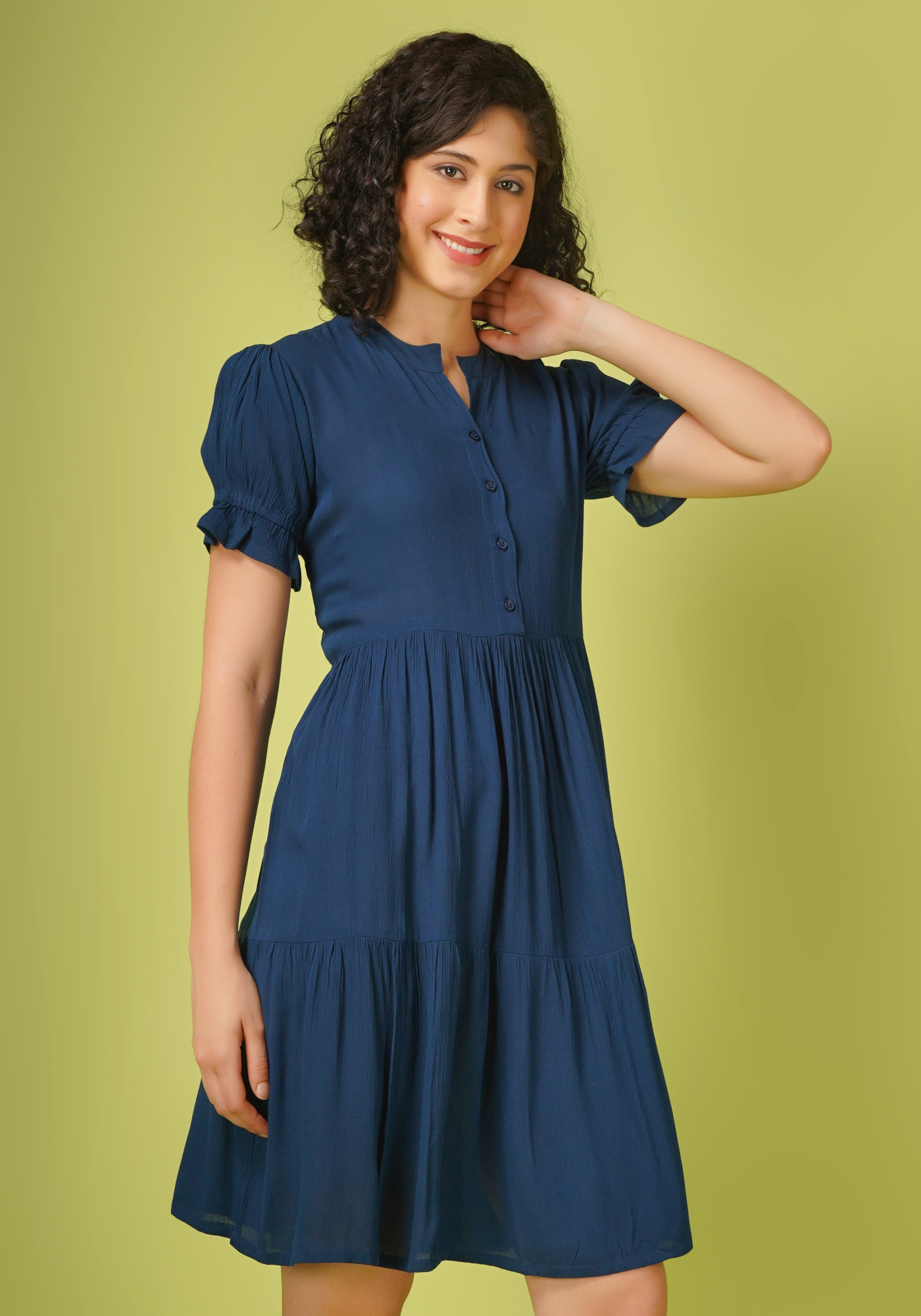 This elegant midi dress combines style and comfort with its chic design. Made from rayon crush fabric, stylish tiered silhouette that falls gracefully to knee length. The dress is adorned with a mandarin collar and features half-puffed sleeves, adding a touch of sophistication. Openable buttons in the front offer both convenience and a customizable look. Perfect for parties and special events, this dress promises a blend of fashion and ease, ensuring you look and feel fabulous.