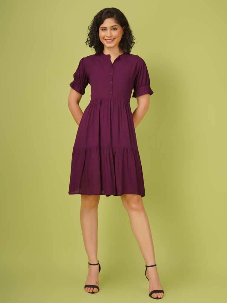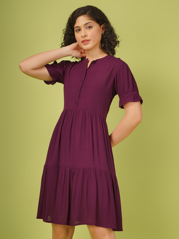 This elegant midi dress combines style and comfort with its chic design. Made from rayon crush fabric, stylish tiered silhouette that falls gracefully to knee length. The dress is adorned with a mandarin collar and features half-puffed sleeves, adding a touch of sophistication. Openable buttons in the front offer both convenience and a customizable look. Perfect for parties and special events, this dress promises a blend of fashion and ease, ensuring you look and feel fabulous.